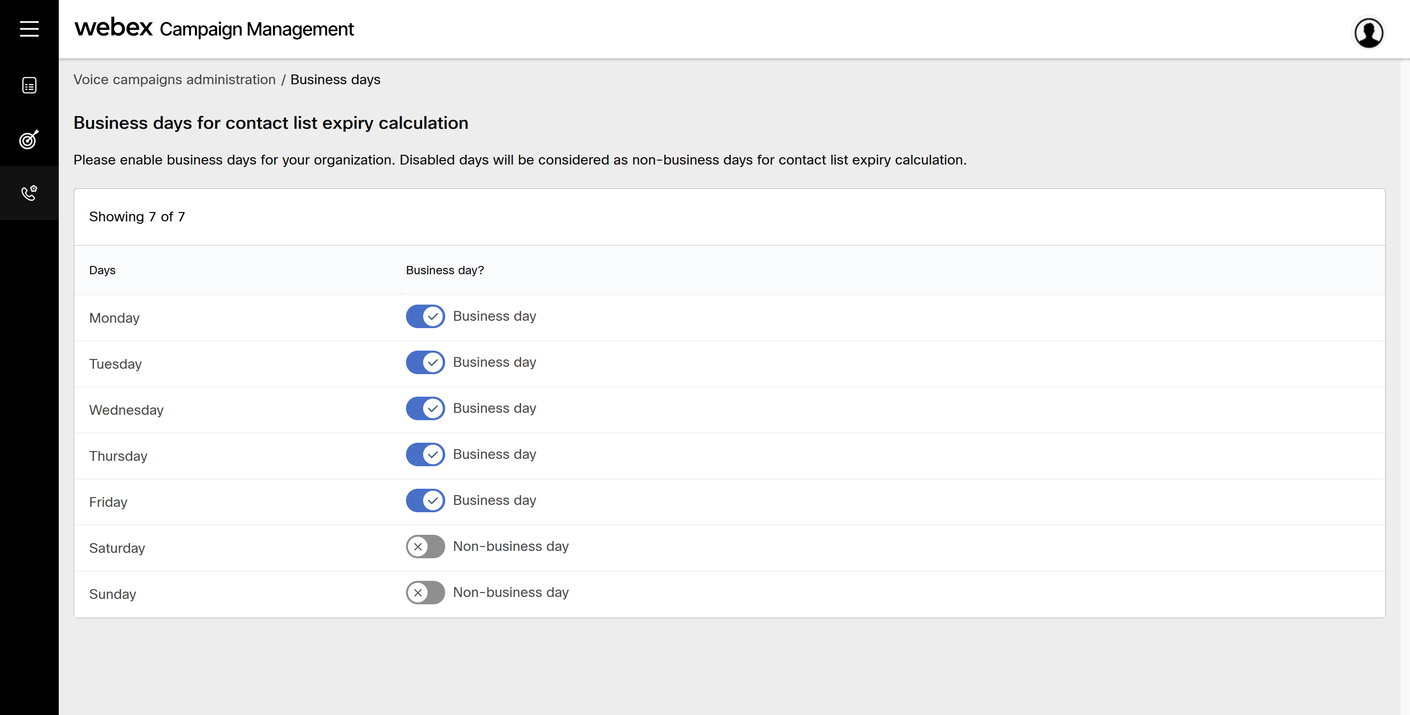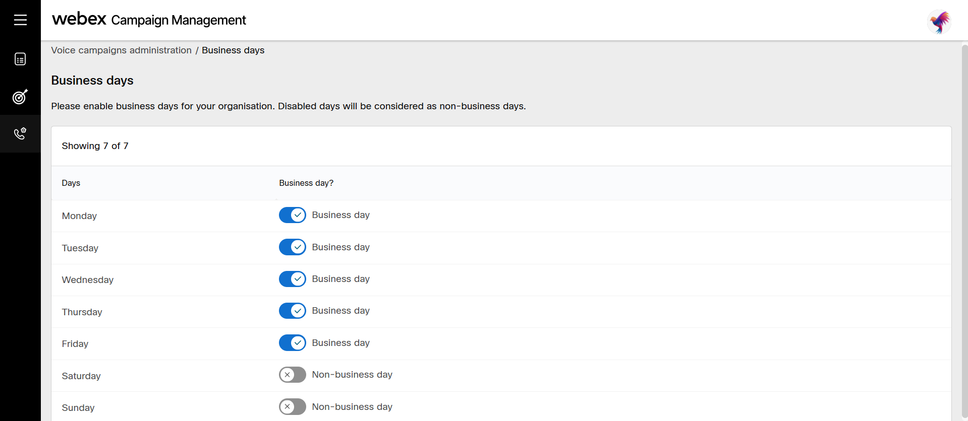 These business days are created in Control Hub application. Webex Campaign Management will receive these business days from Control Hub application. You can only enable or disable a business day in Webex Campaign Management.