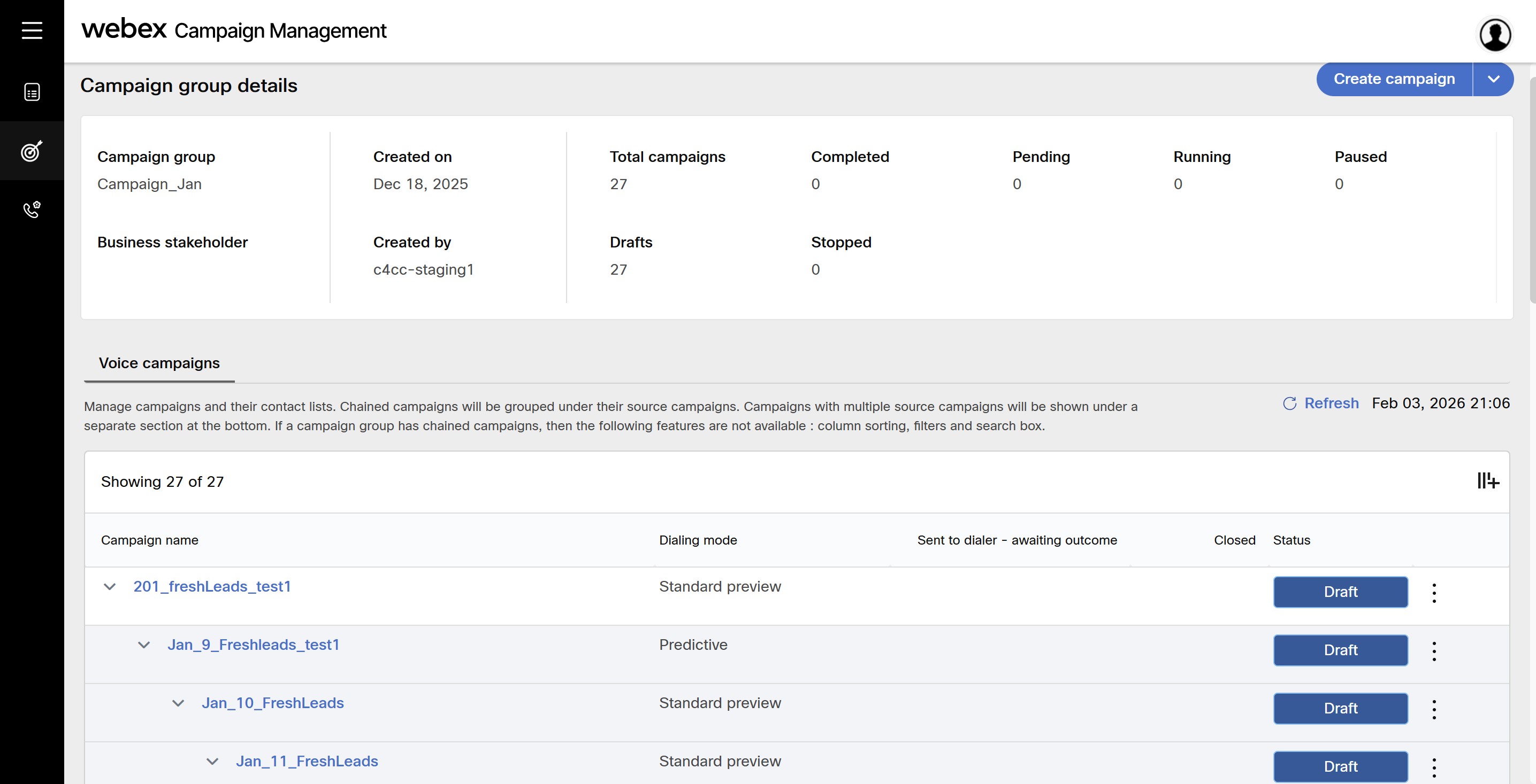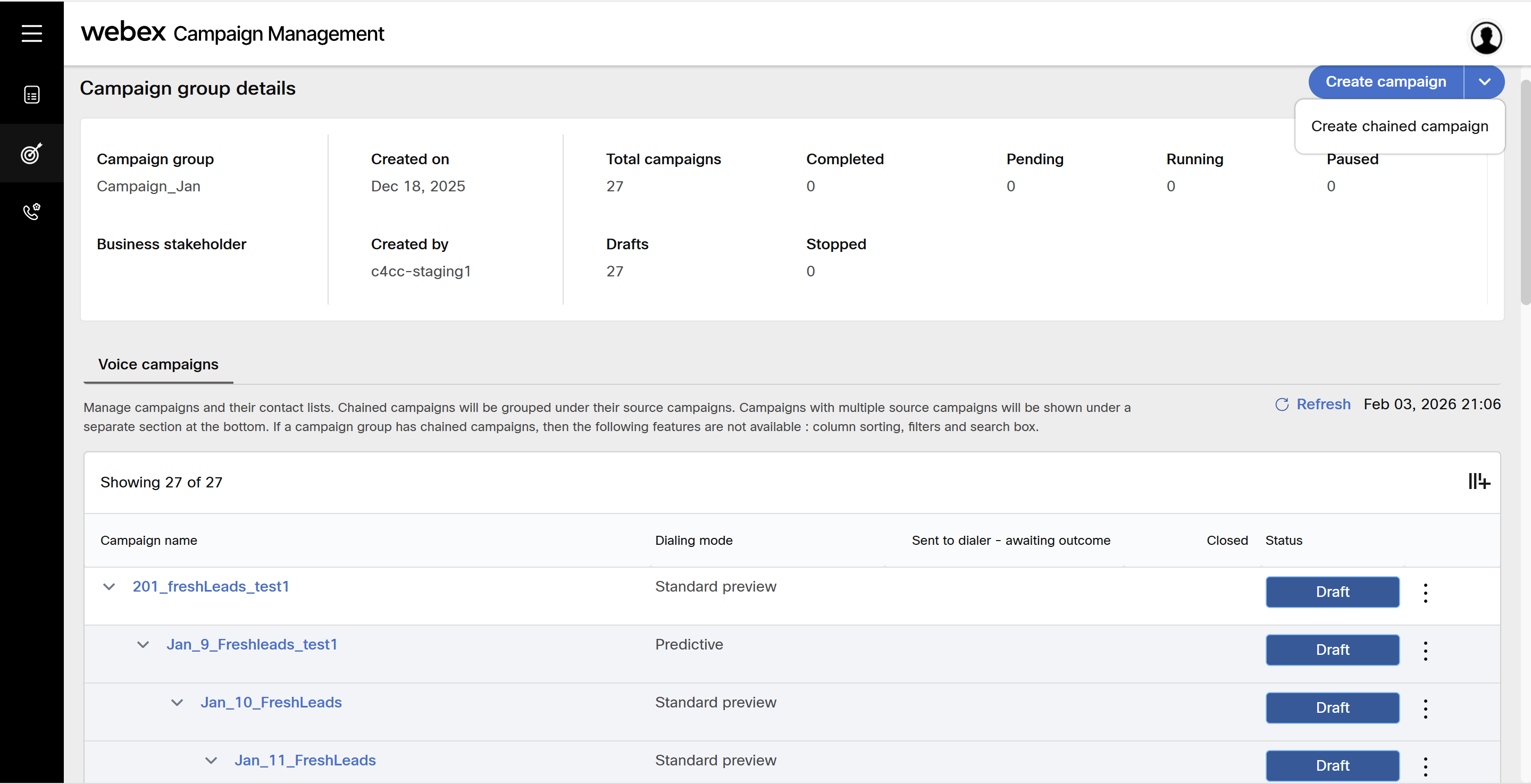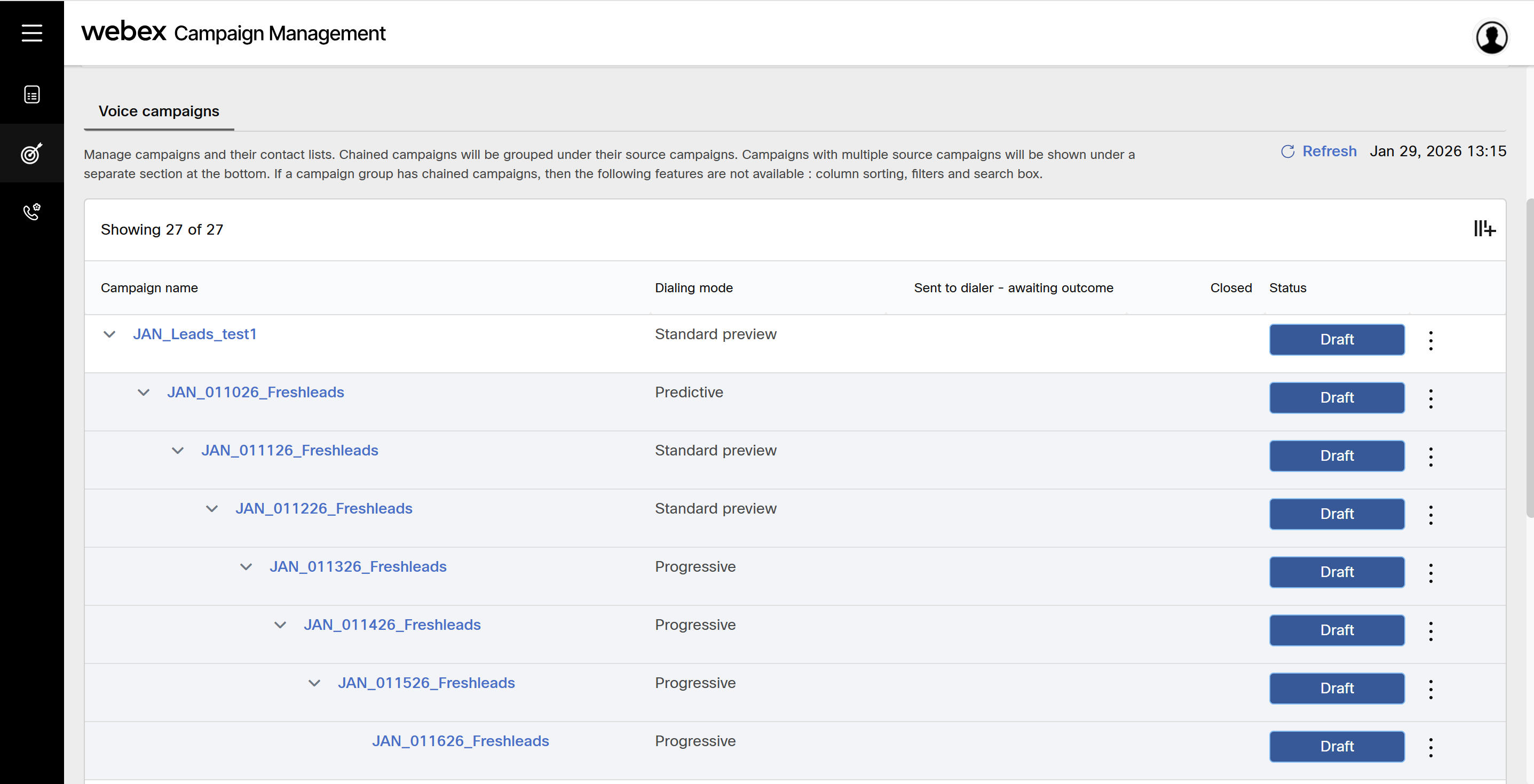 A new columns in the Campaign details grid is added i.e. 'Closed-Transferred to chained campaign' - This column shows the # of contact which are transferred to the chained campaign. This column is also available in the 'Manage contact list' which can be useful to understand how many contacts have moved to a chained campaign from the respective contact list.