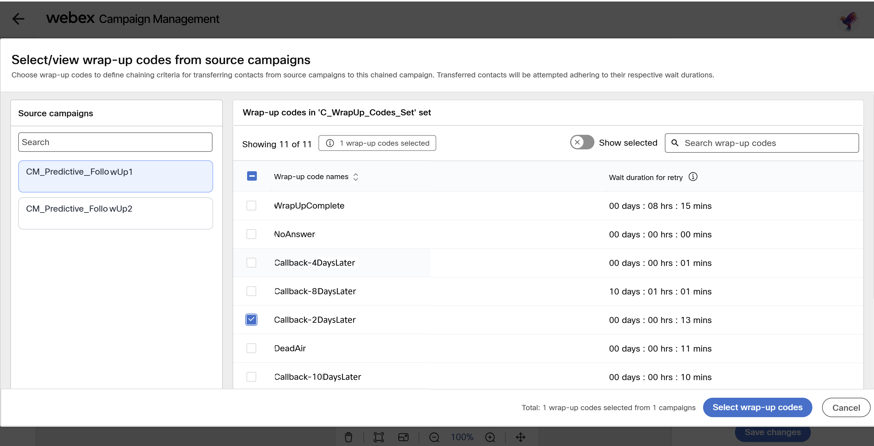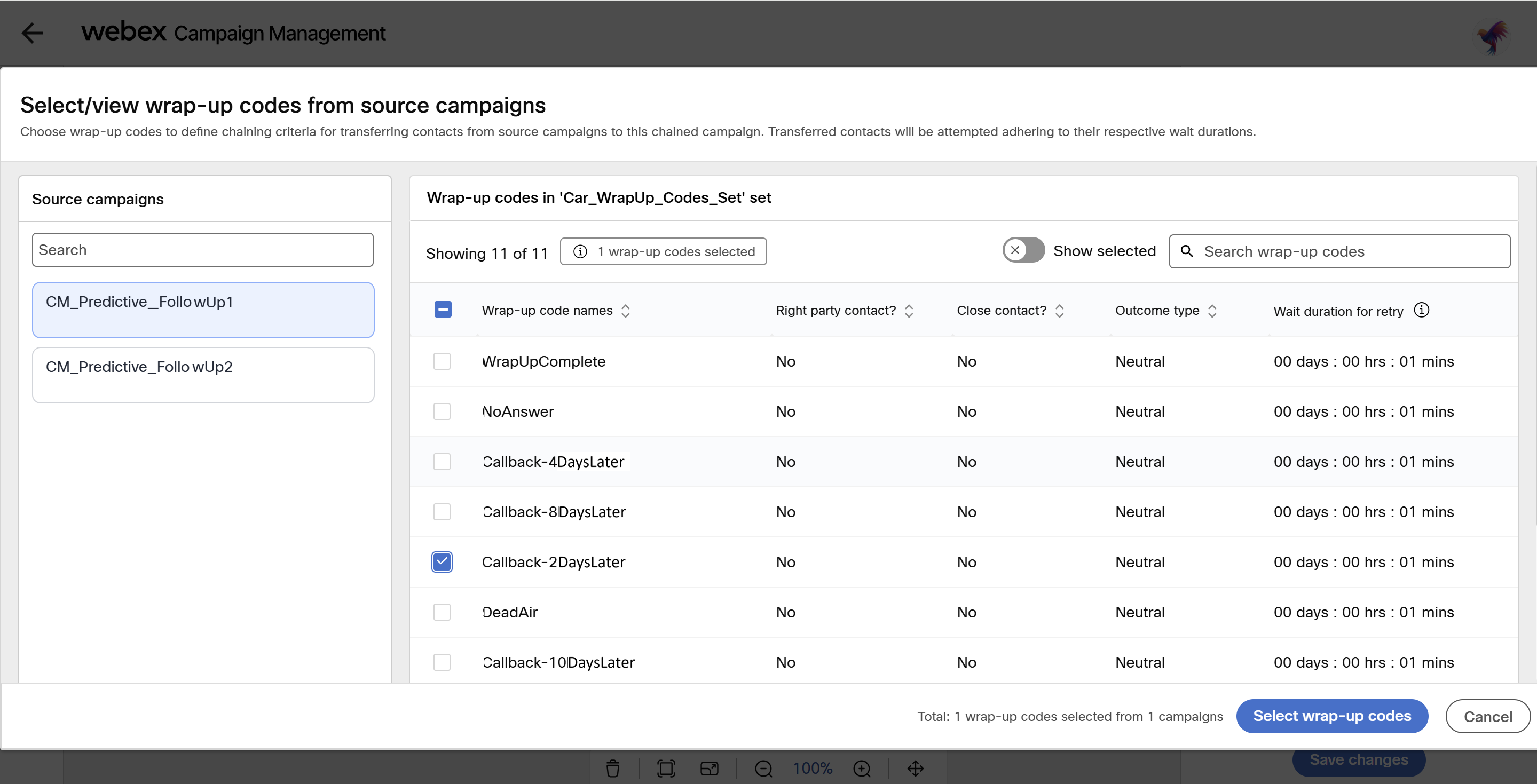 - You can select ore or more campaigns and click Select campaigns. The contacts of those campaigns will be transferred to chained campaign based on the wrap-up code and telephony outcome selected in the next steps.