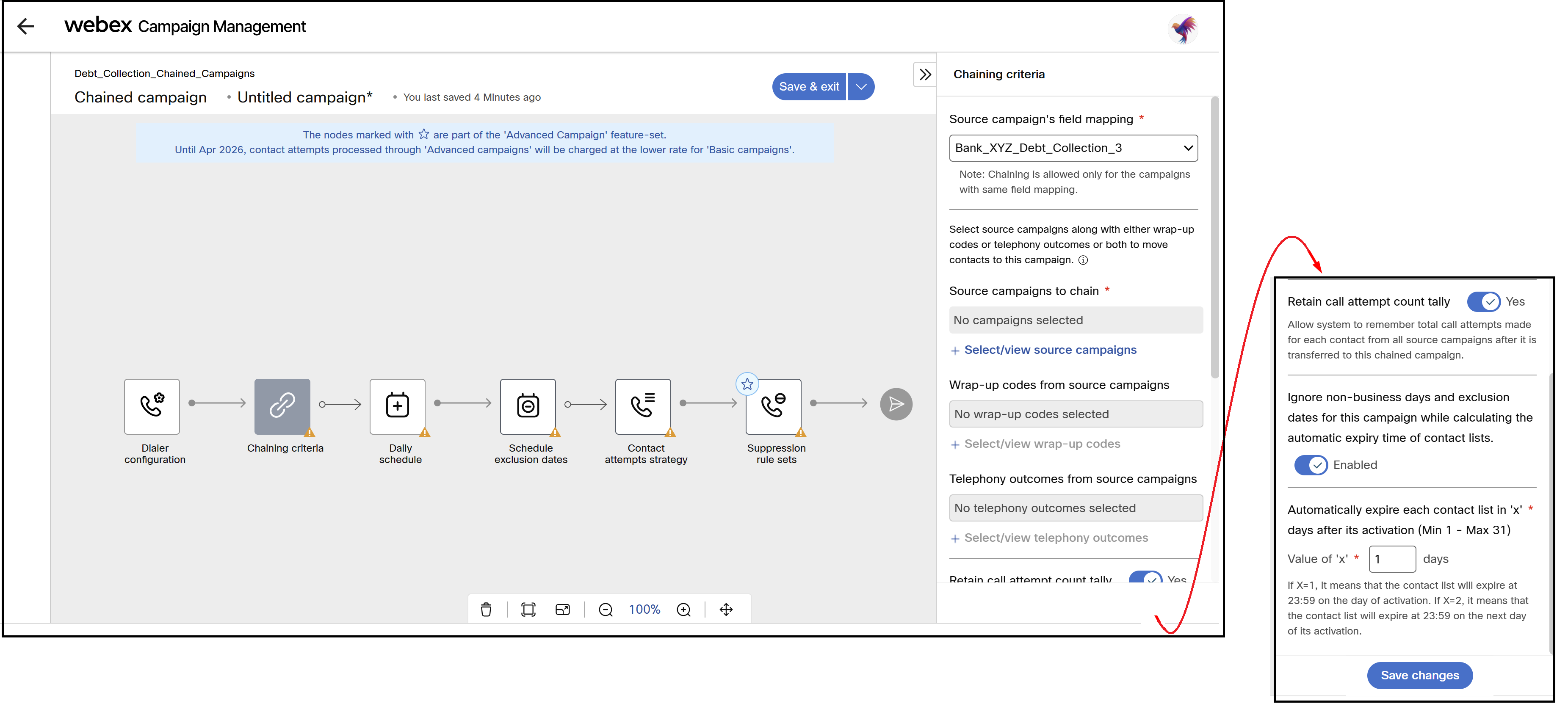- If you want the system to remember how many times a contact was called across all source campaigns, enable Retain call attempt count tally. When disabled, the count will reset to zero in chained campaign.