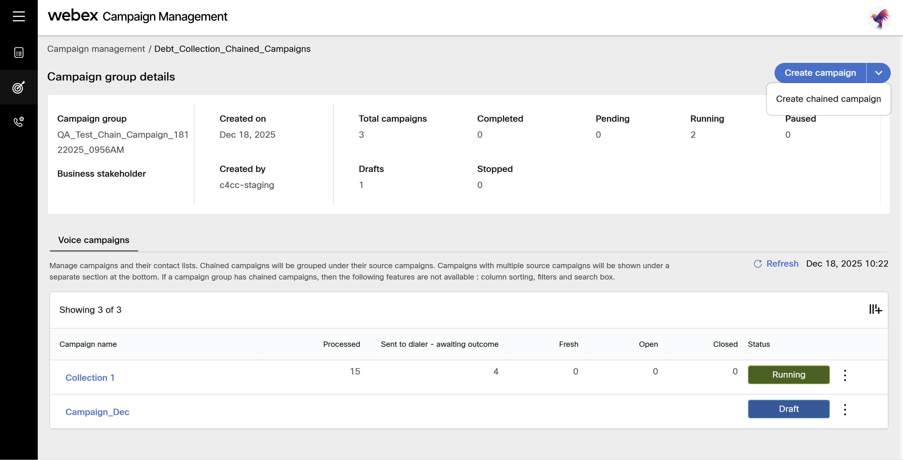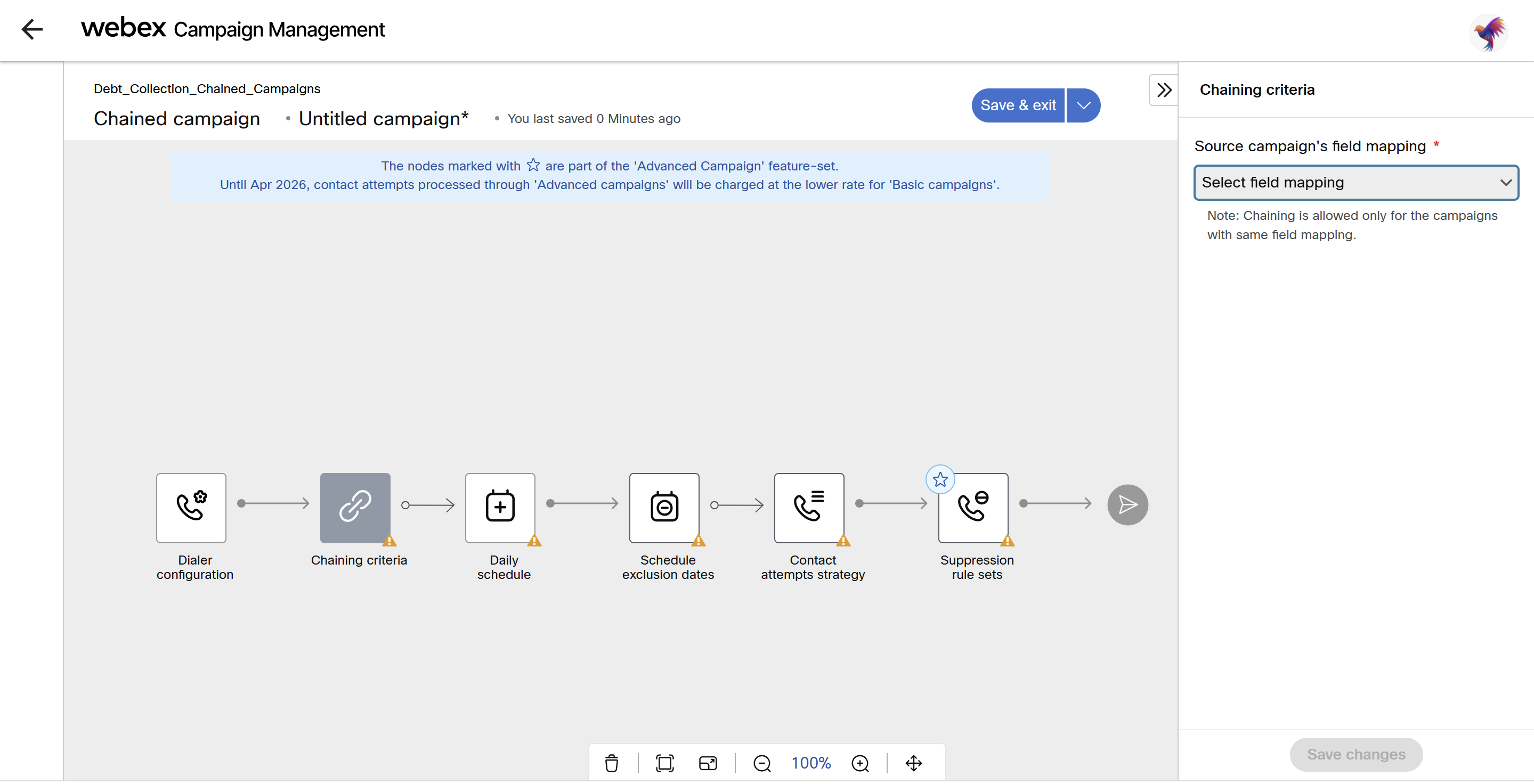 - At least one source campaign should have minimum one wrap-up codes or telephony outcome specified in the chaining criteria to be able to save the chaining campaign.