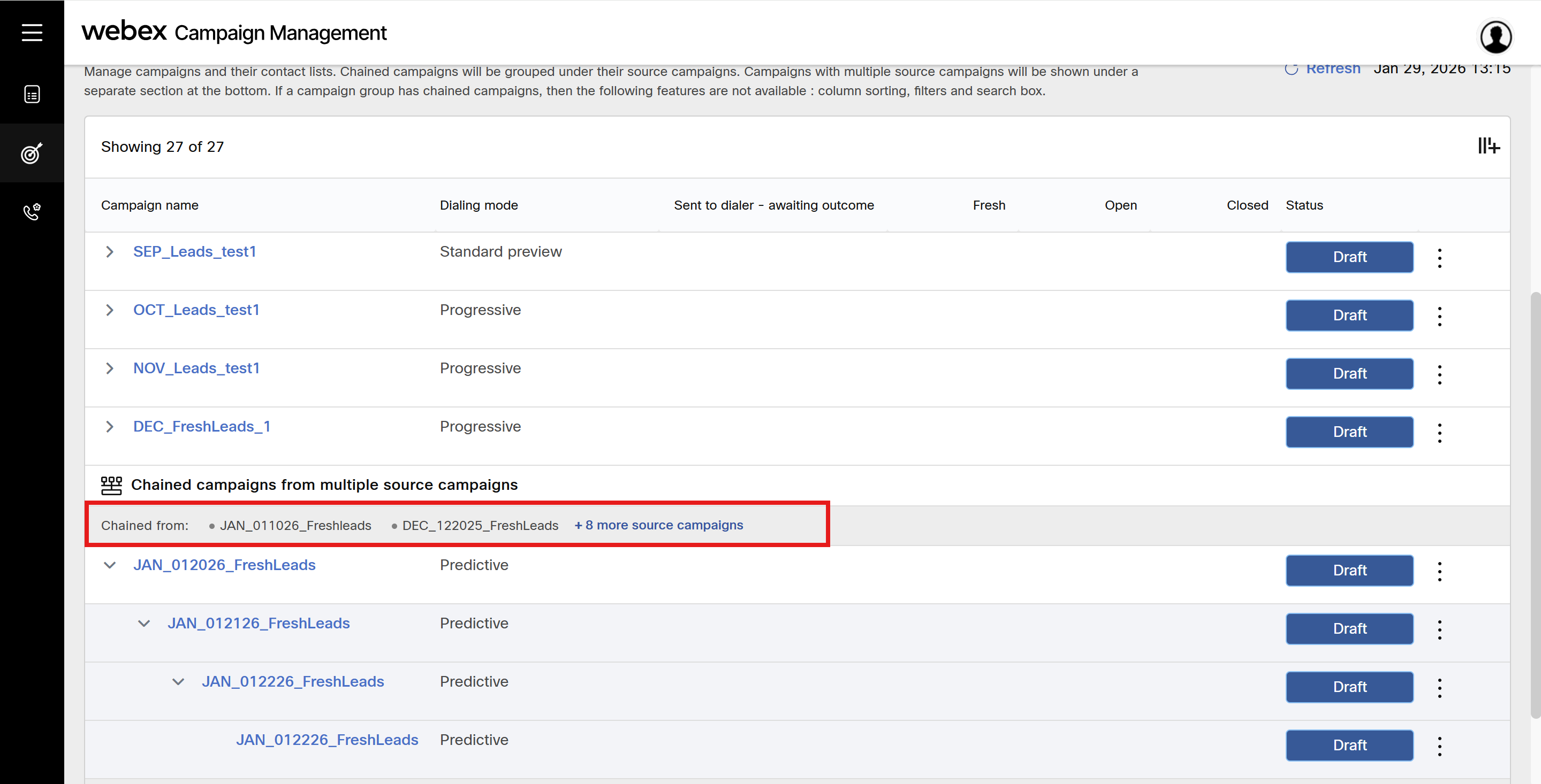 If a campaign is a 'Shared chain' i.e. has multiple source campaign , then once this chained campaign is saved, it will be displayed at the bottom of the grid where you can see all the source campaigns and its respective contact list in the bar above.