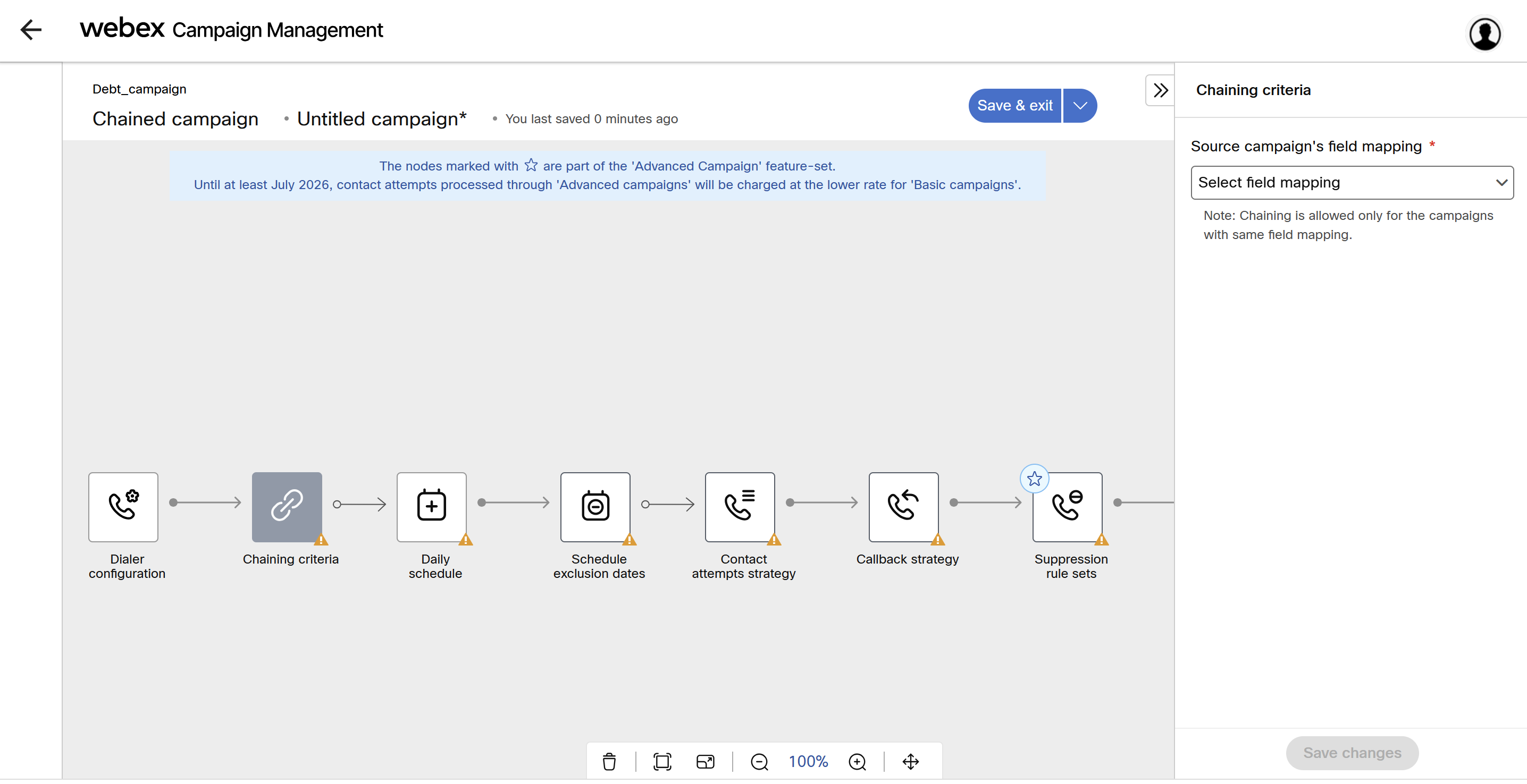 At least one source campaign should have minimum one wrap-up codes or telephony outcome specified in the chaining criteria to be able to save the chaining campaign.