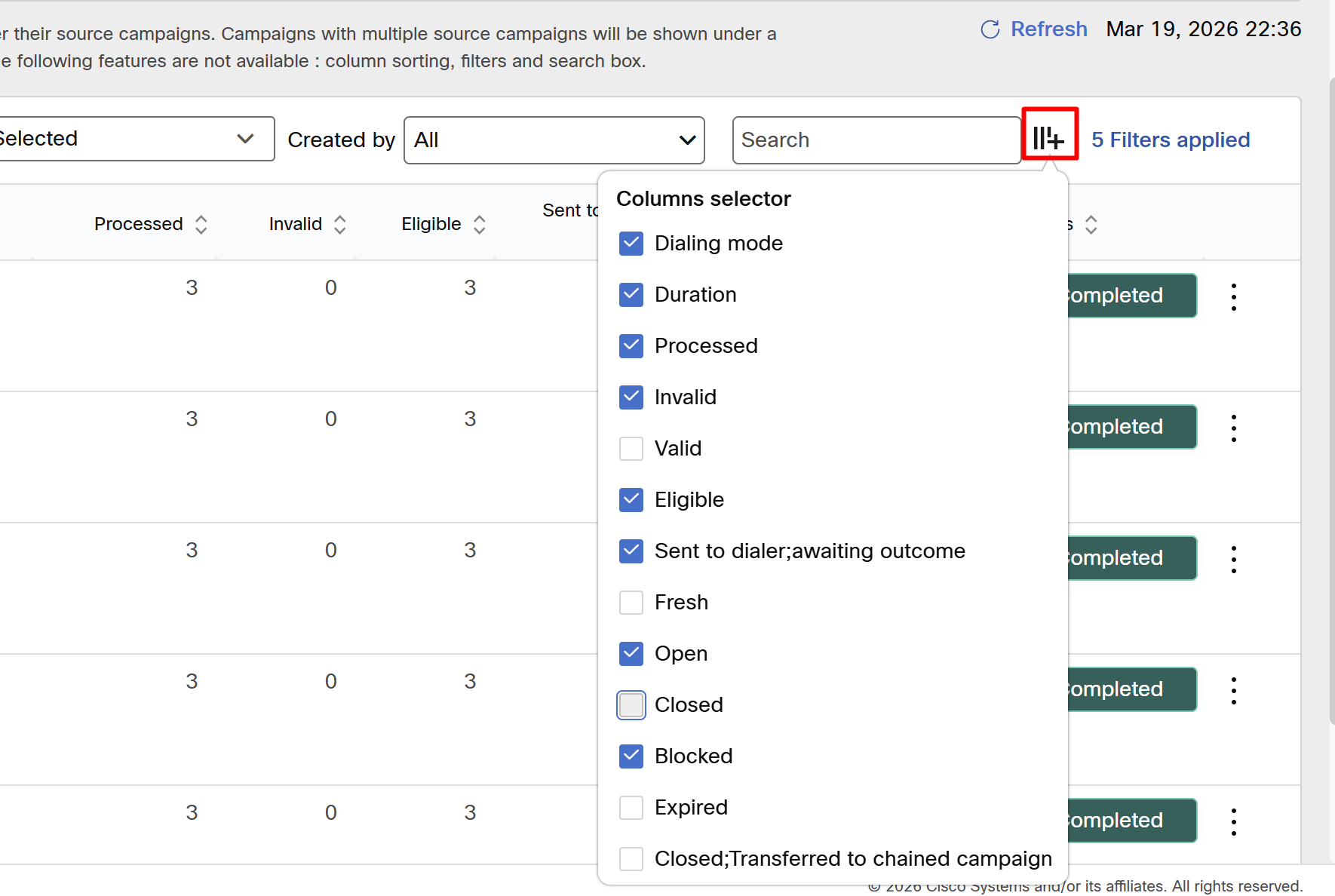 If a campaign group has campaign chaining , the filters in the campaign details listing grid will not be accessible.