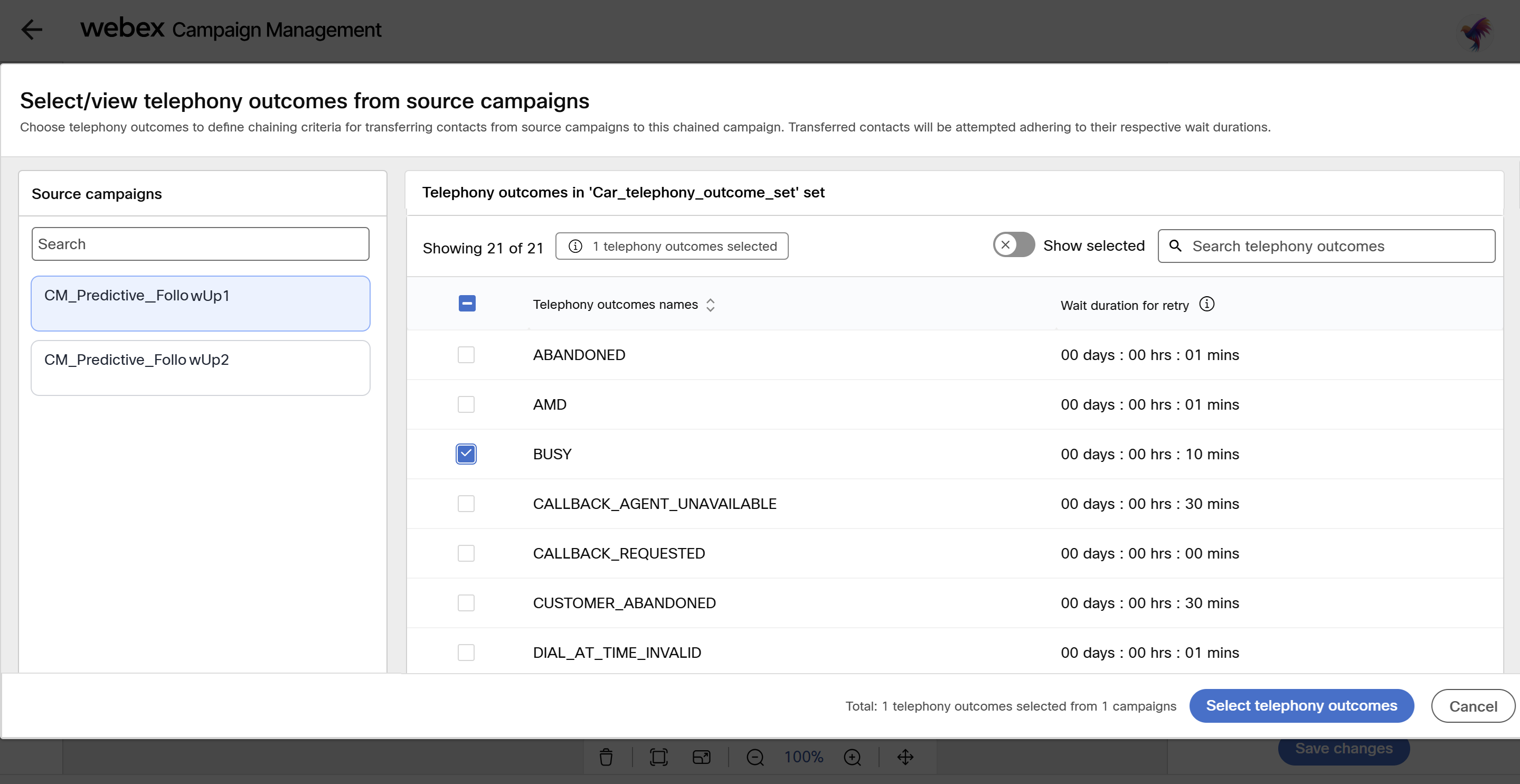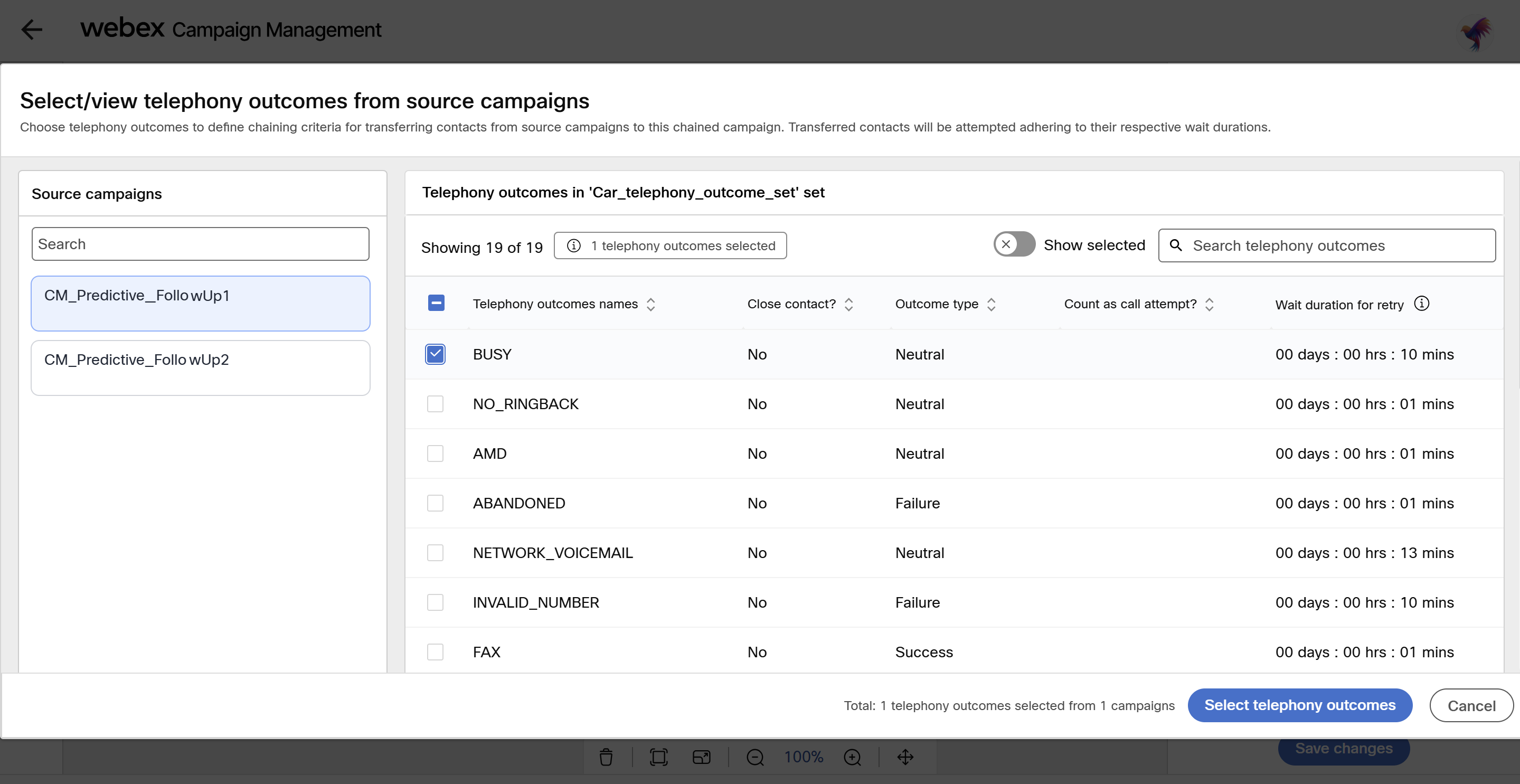 - Click Select/view telephony outcome and select the required telephony outcomes and click Select telephony outcomes to save the selection.