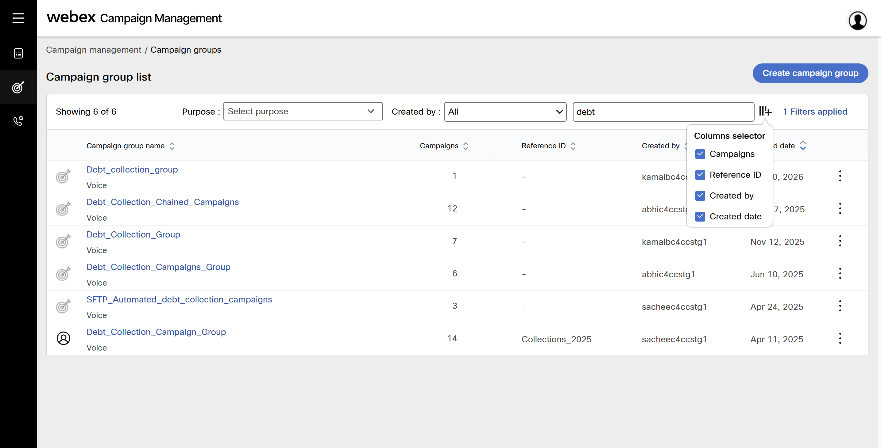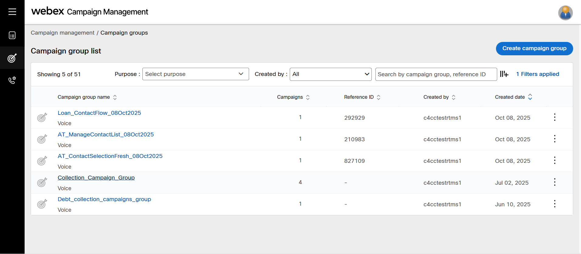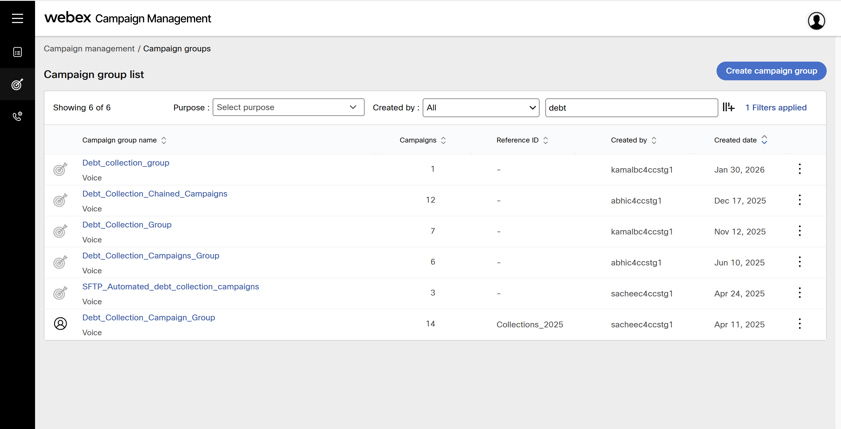 Webex Campaign houses all the campaigns and under the Campaign group list screen. You can view all your campaigns in chronological order, with the campaign attributes listed.