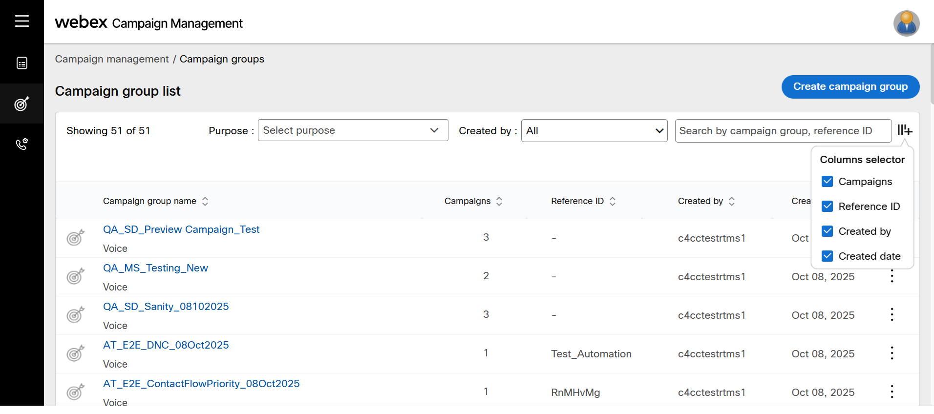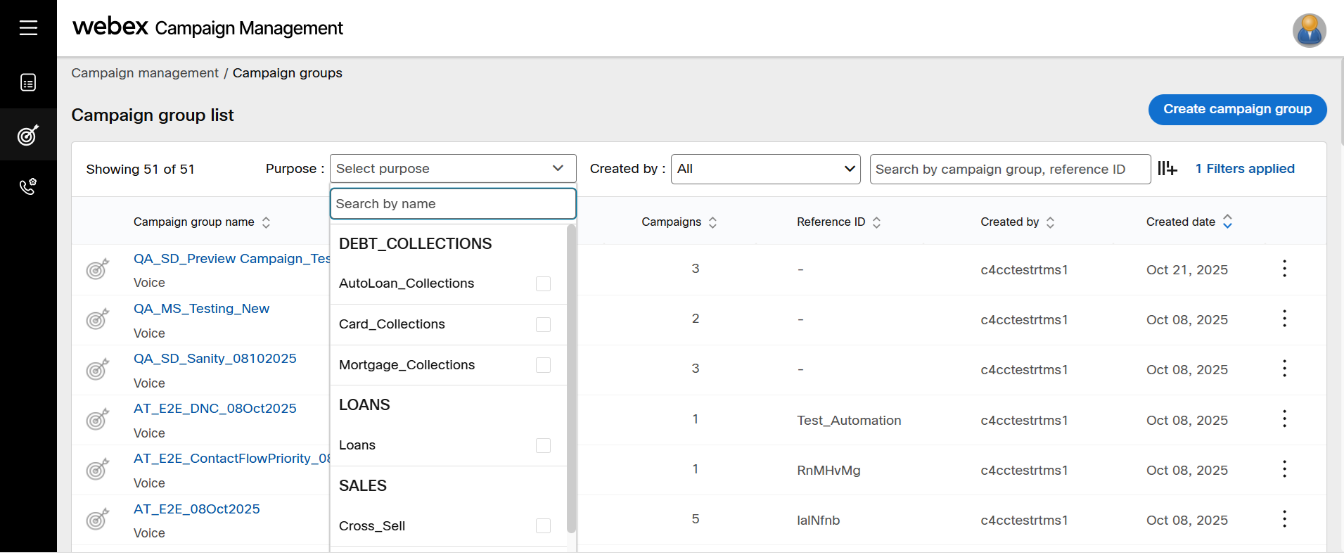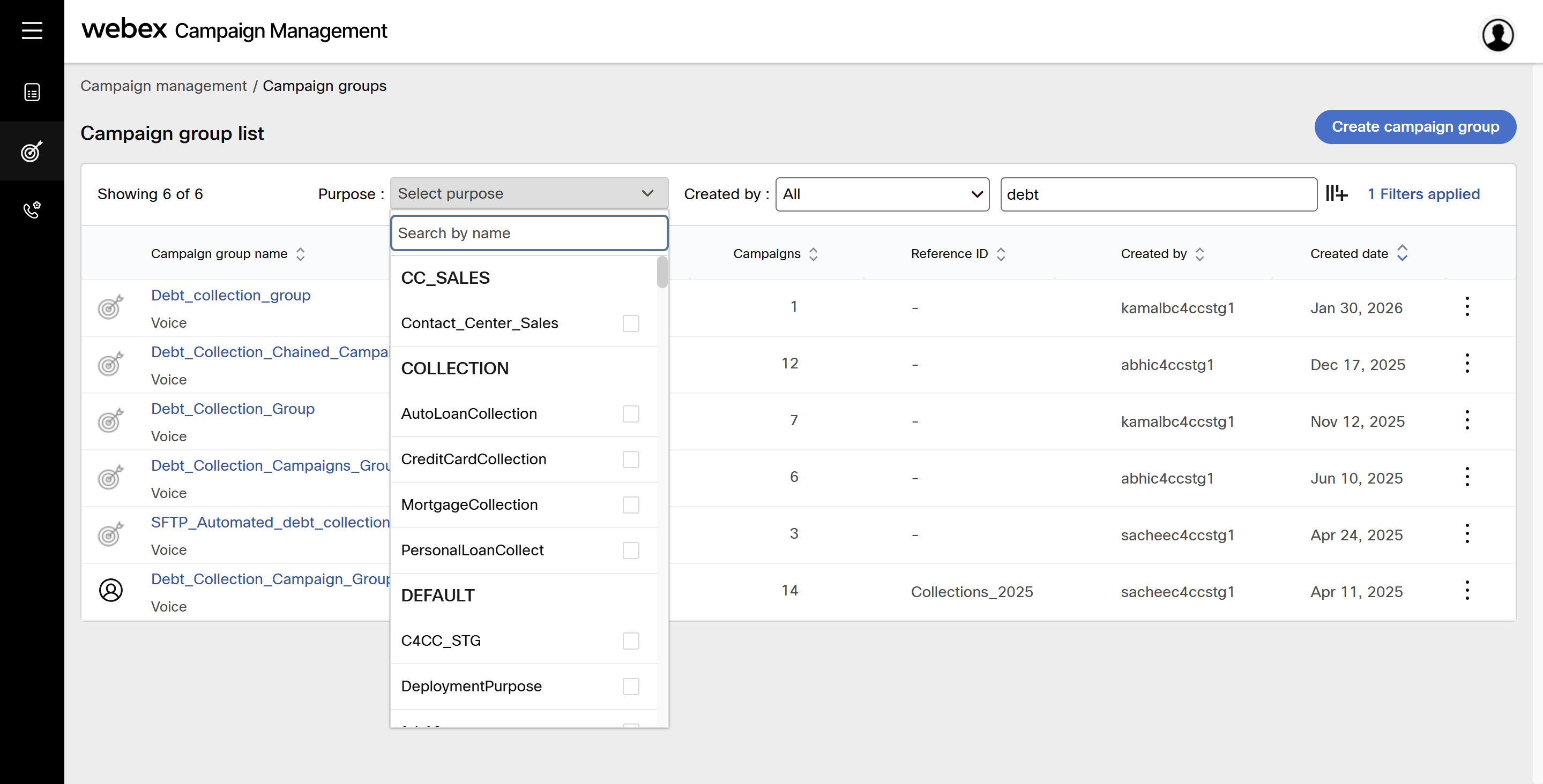 Webex Campaign houses all the campaigns and under the Campaign group list screen. You can view all your campaigns in chronological order, with the campaign attributes listed.