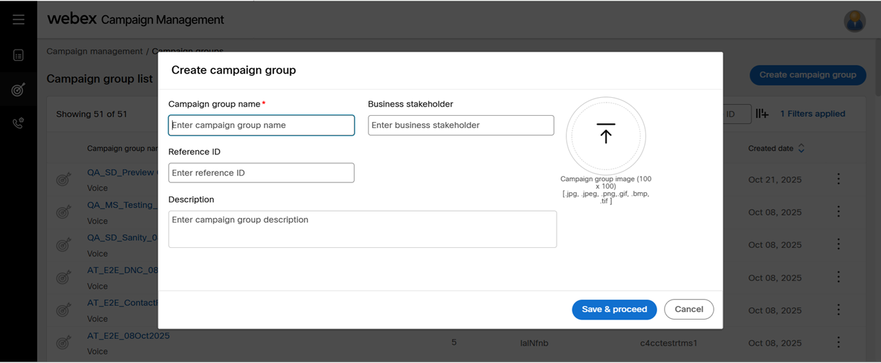 - Campaign image: Add a thumbnail image for the campaign group. The size of the image should not be more than 100 x 100 px. The supported formats are .jpg, .jpeg, .png, .gif, .bmp, and .tif.
