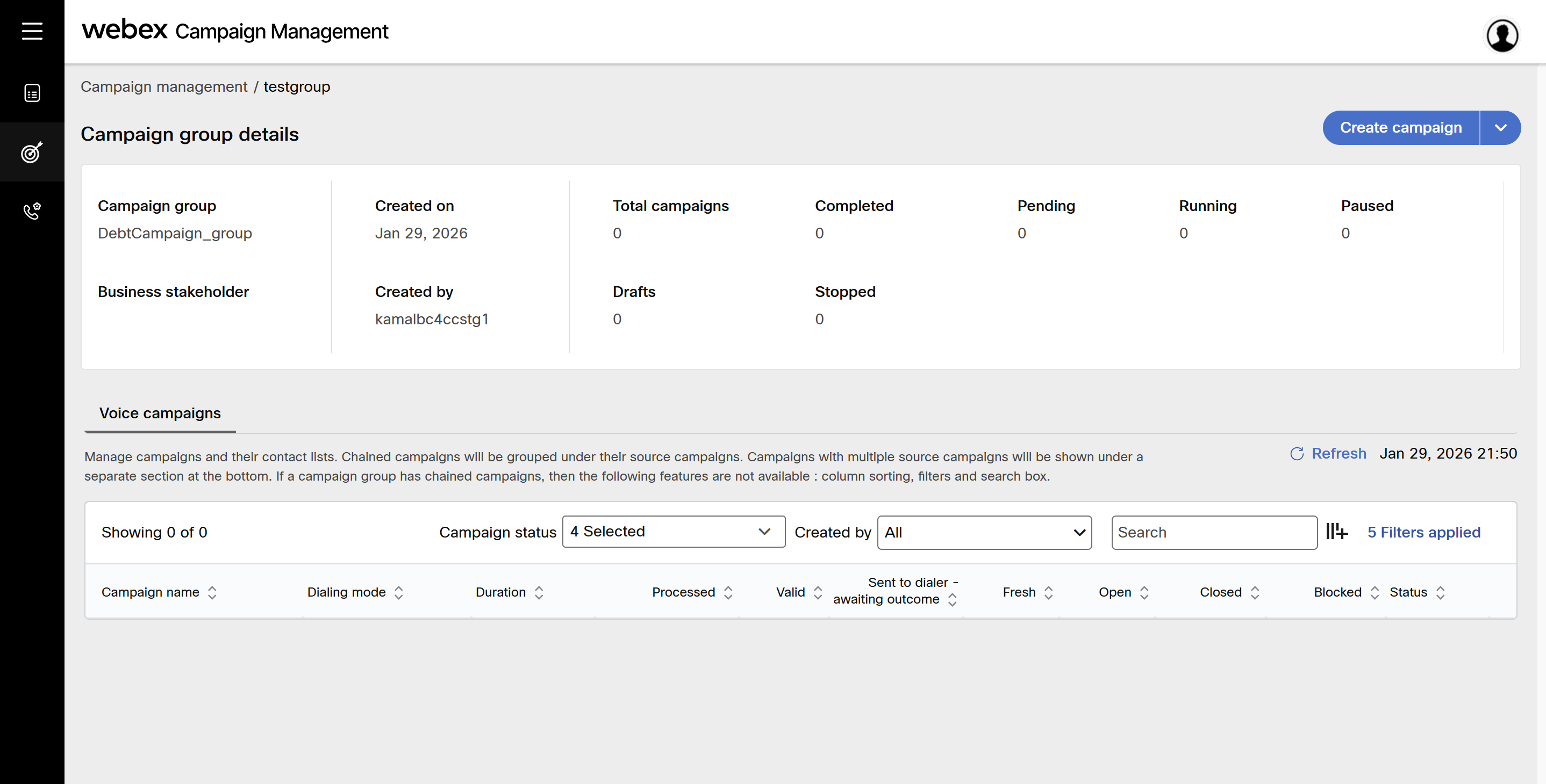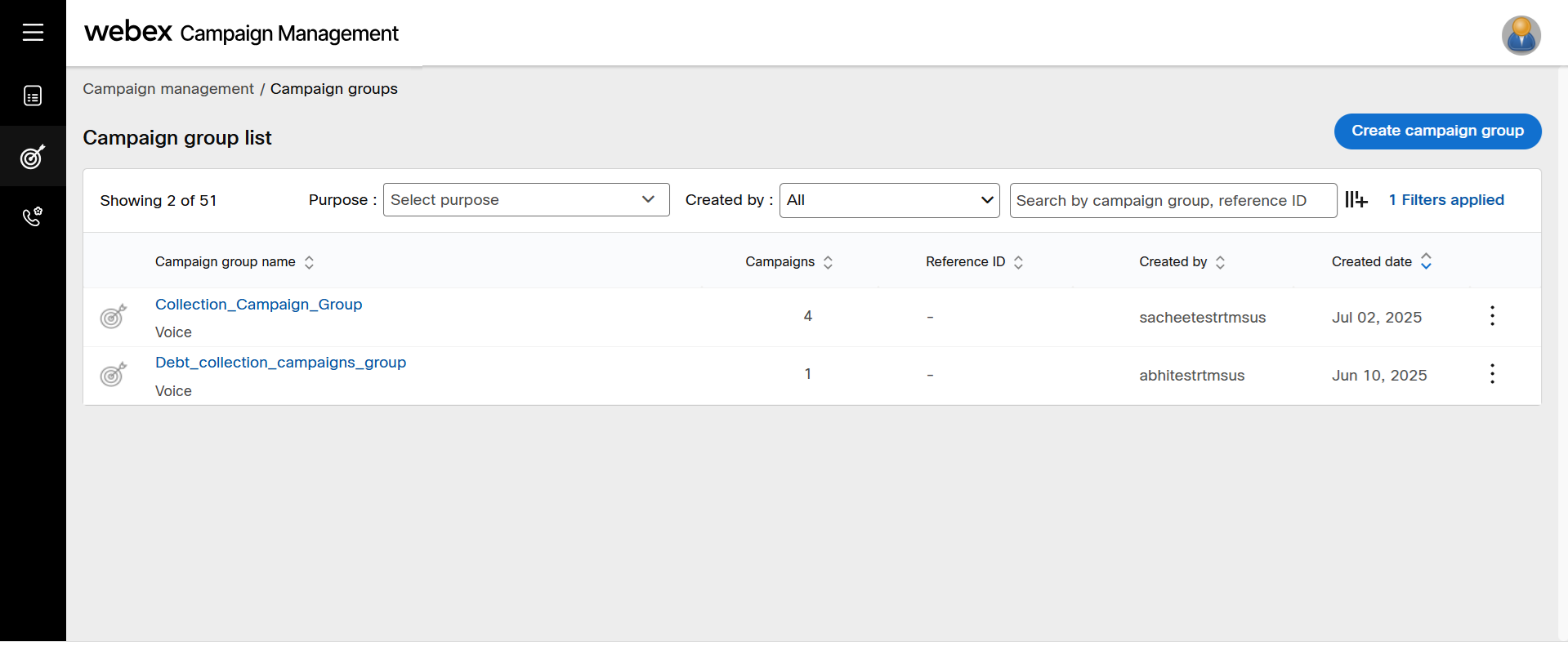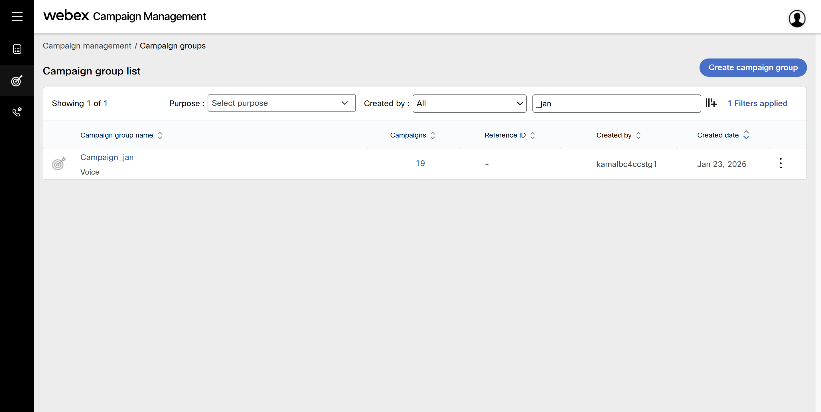 - From the left menu, navigate to Campaign management > Campaign group. The campaign group list screen appears. It will display all the campaigns created in this tenant.