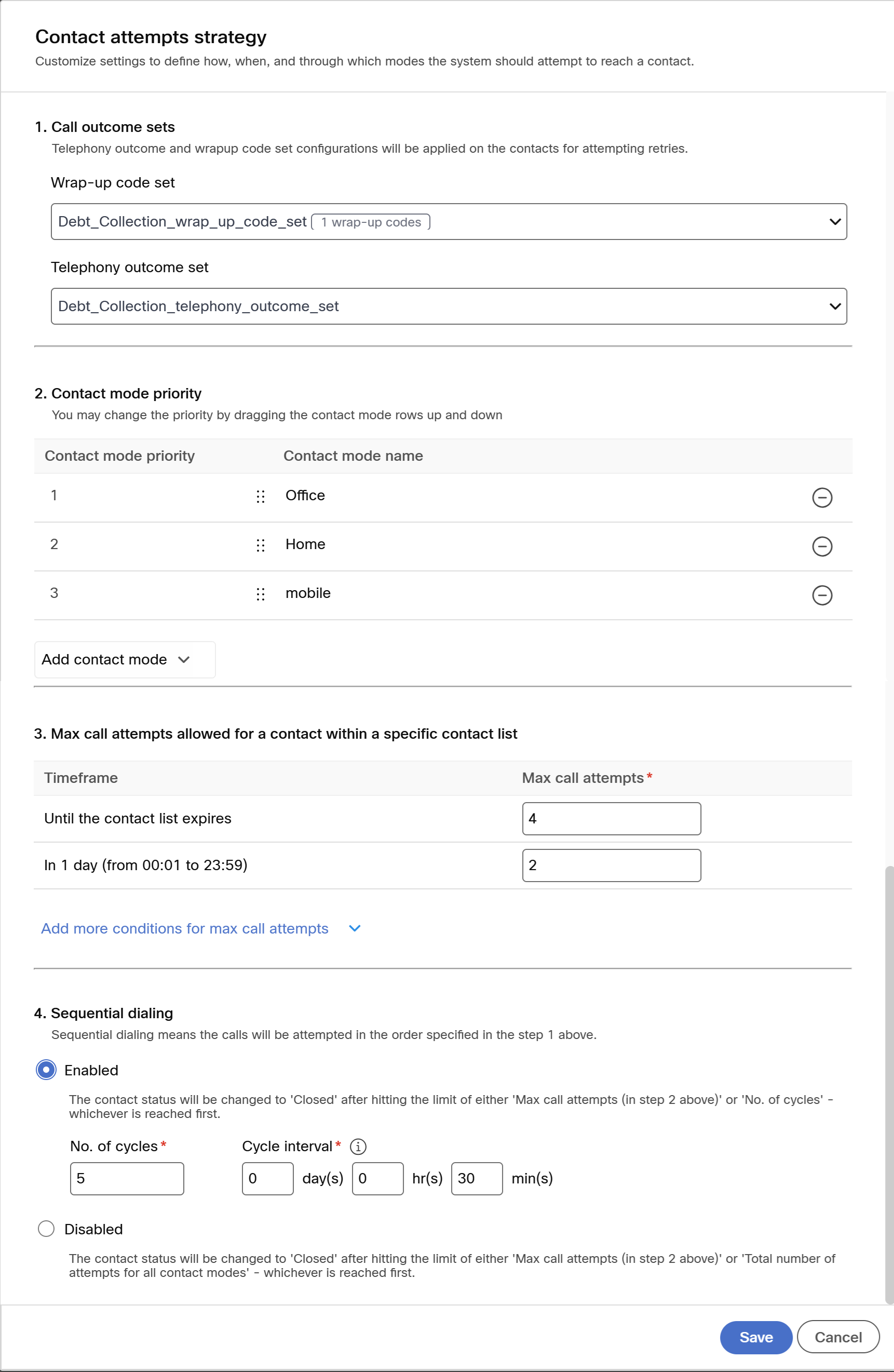In Contact Center, a Contact attempts strategy is a plan that defines how, when, and through which channels a system should attempt to reach a contact. This strategy includes setting the priority of contact modes—such as Mobile number, Office number, Home number—and determining the number and timing of contact attempts. These rules can be customized based on country or state specific regulations governing communication frequency, time-of-day restrictions, and opt-in/opt-out requirements.