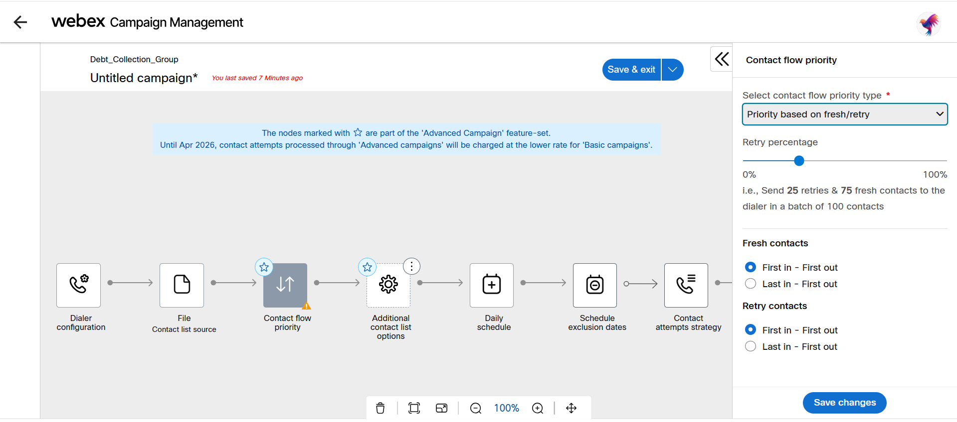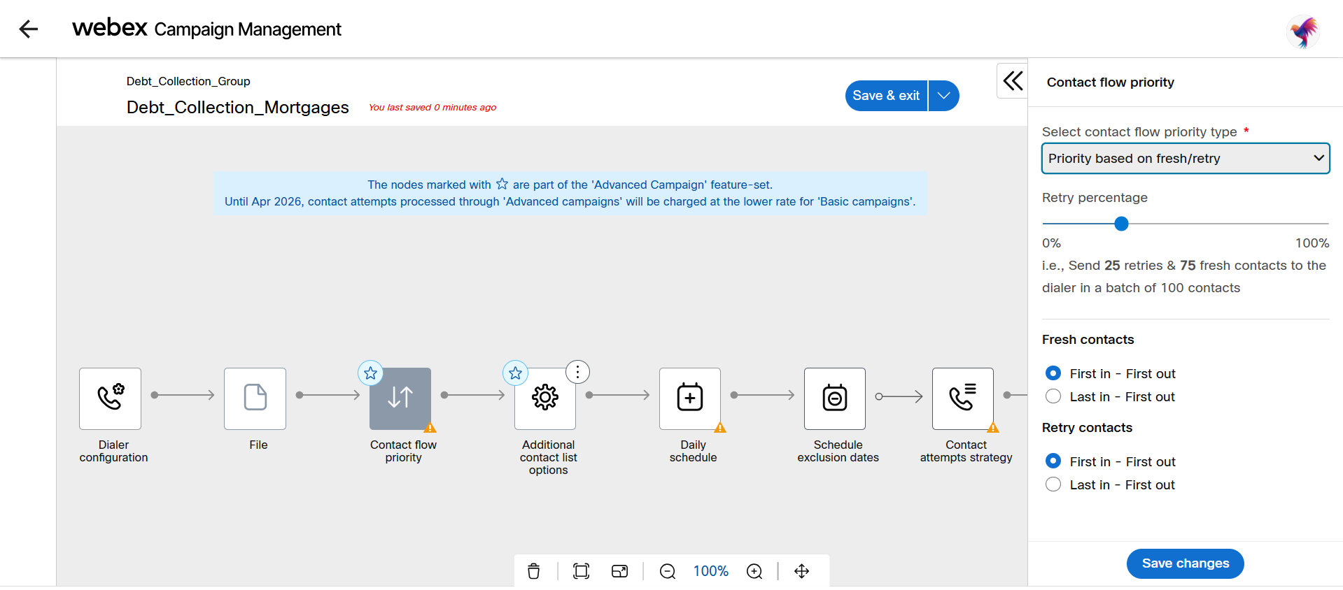 - For ‘Fresh’ contact records: If Priority based on “Fresh/Retry”, select if Fresh and Retry should be ordered by first in first out or last in first out.