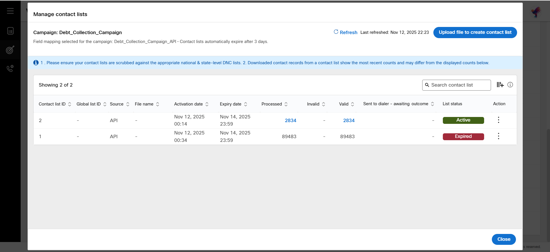 Webex campaign provides contact list management APIs to programmatically create and manage contact lists, automate contact ingestion, and expire contact lists at the campaign end time.