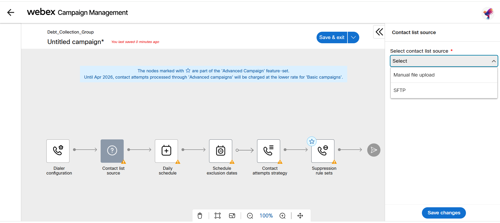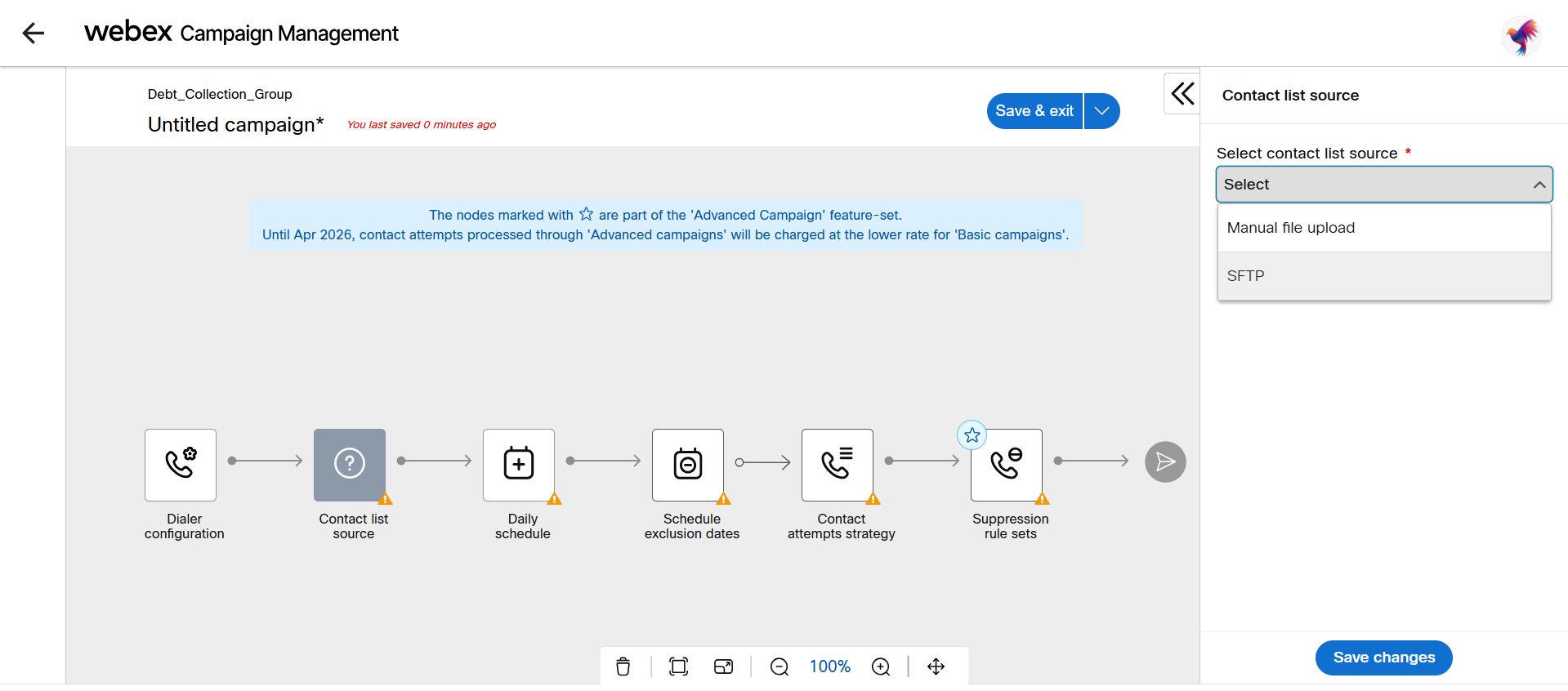 - After selecting the Contact list source node, the right pane will display the sources you can select. Select Manual file upload from the drop-down menu.