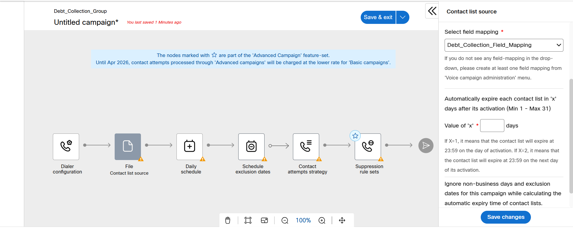 After you configure all the nodes and save the campaign and then configure the contact list file using Mange contact list.