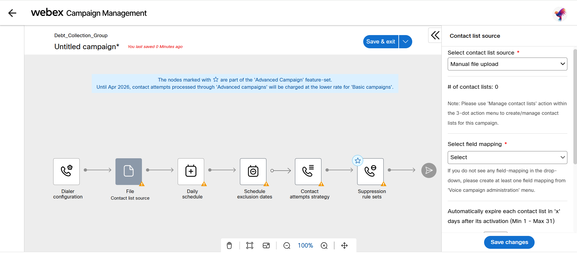 If you want to configure the contact list source as Manual file upload, configure the below configuration: