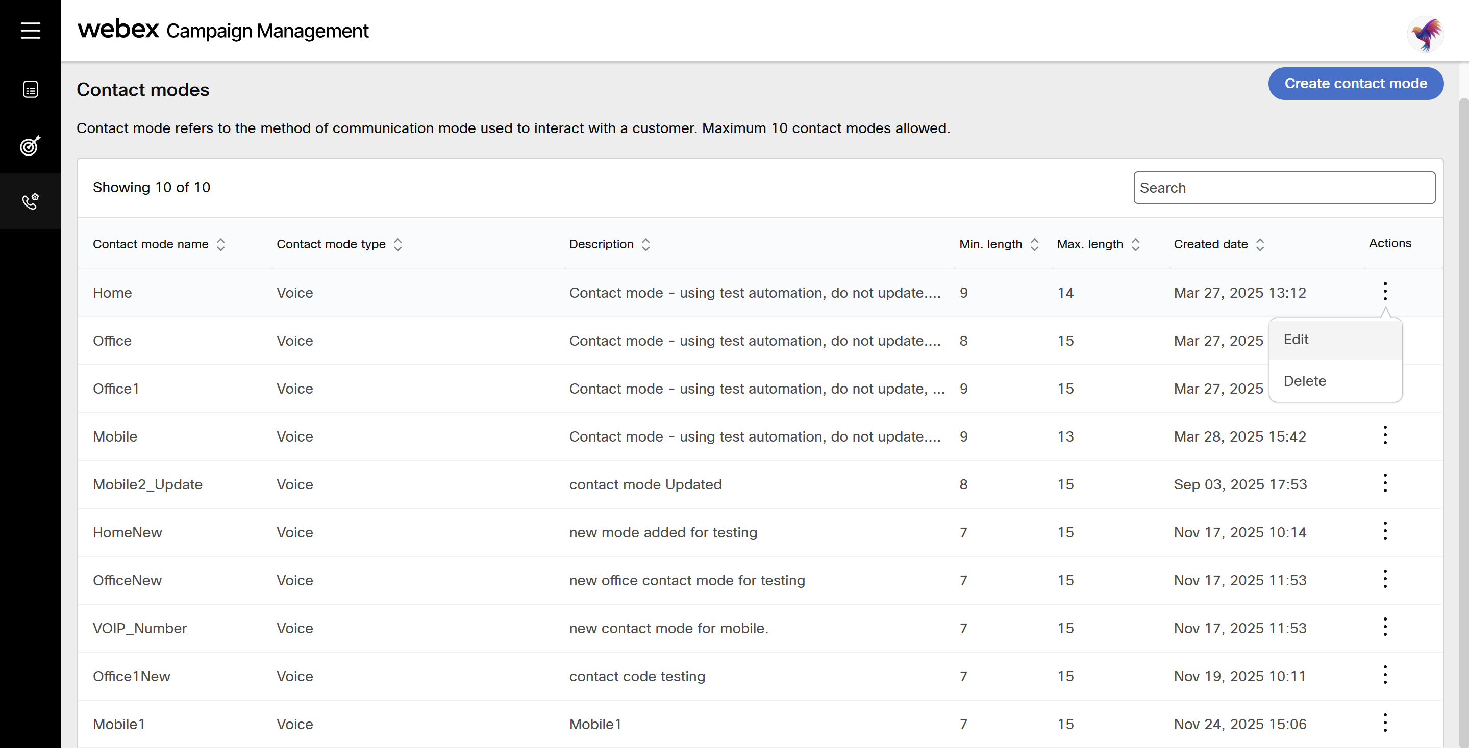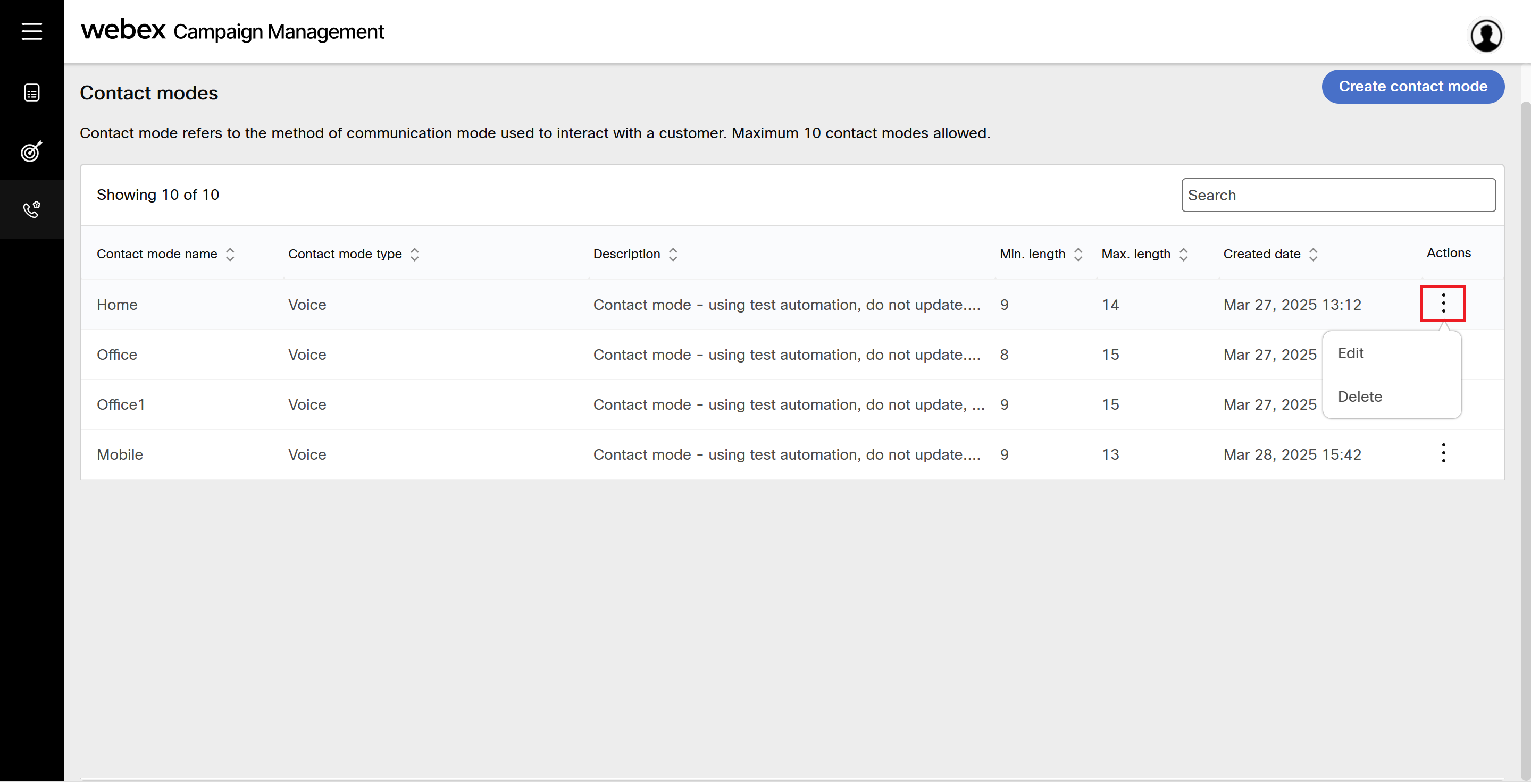 - Navigate to Voice campaigns administration section and click Contact modes. The screen will display contact modes screen. Click the ellipses icon of the required contact mode and click Delete.