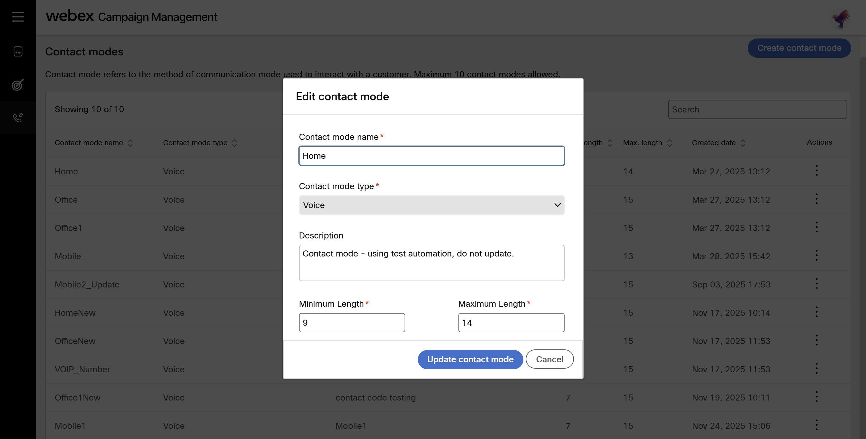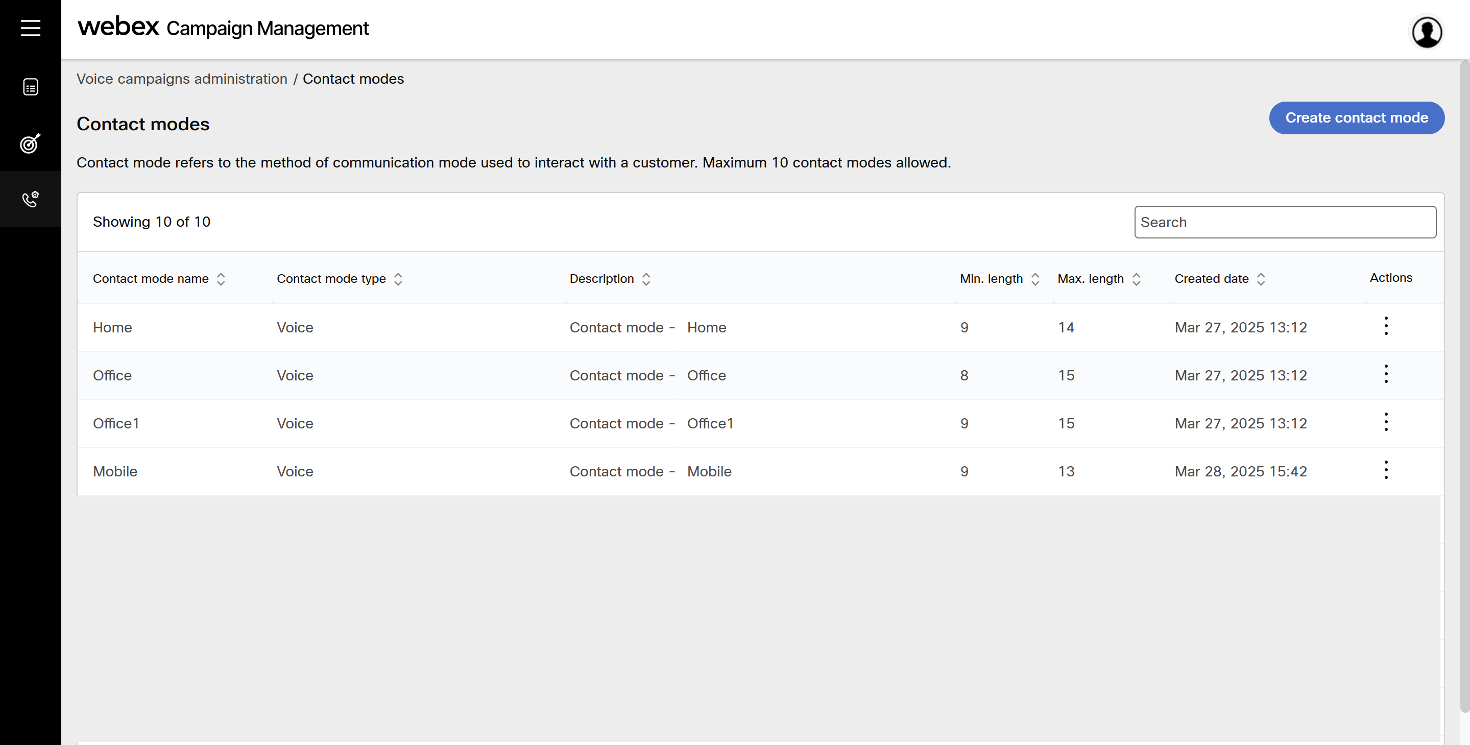 - Navigate to Voice campaigns administration section and click Contact modes. The screen will display contact modes screen.