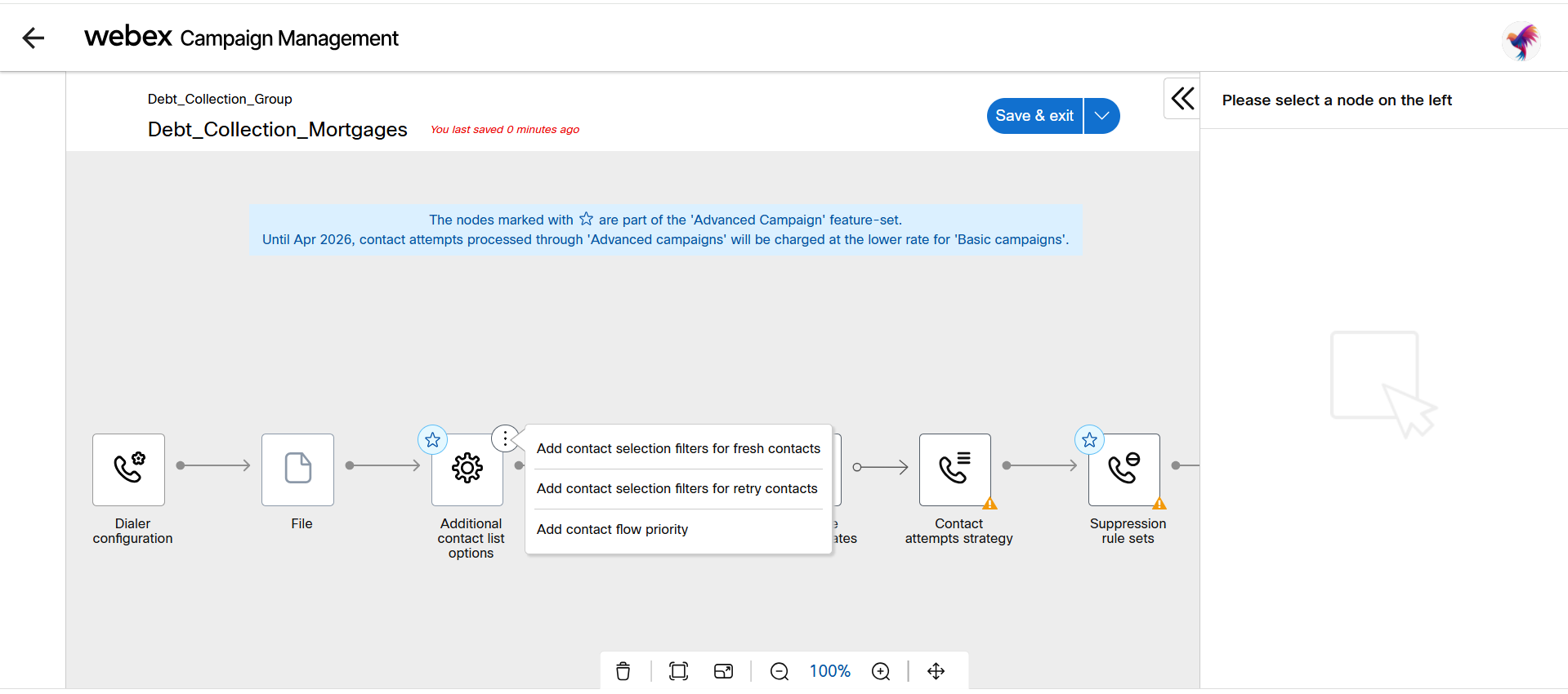 - Click Add contact selection filters for fresh contacts. Select the node.