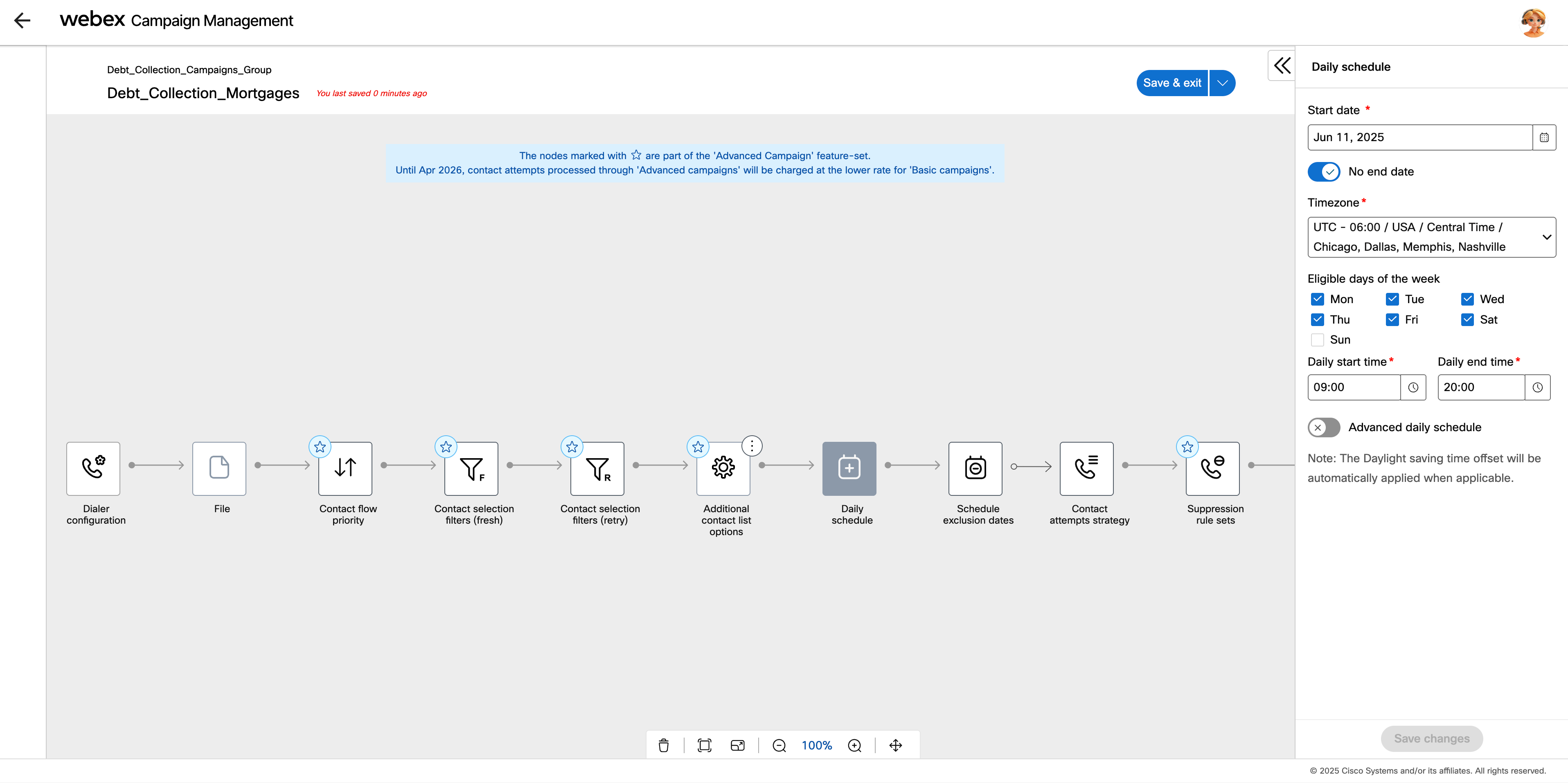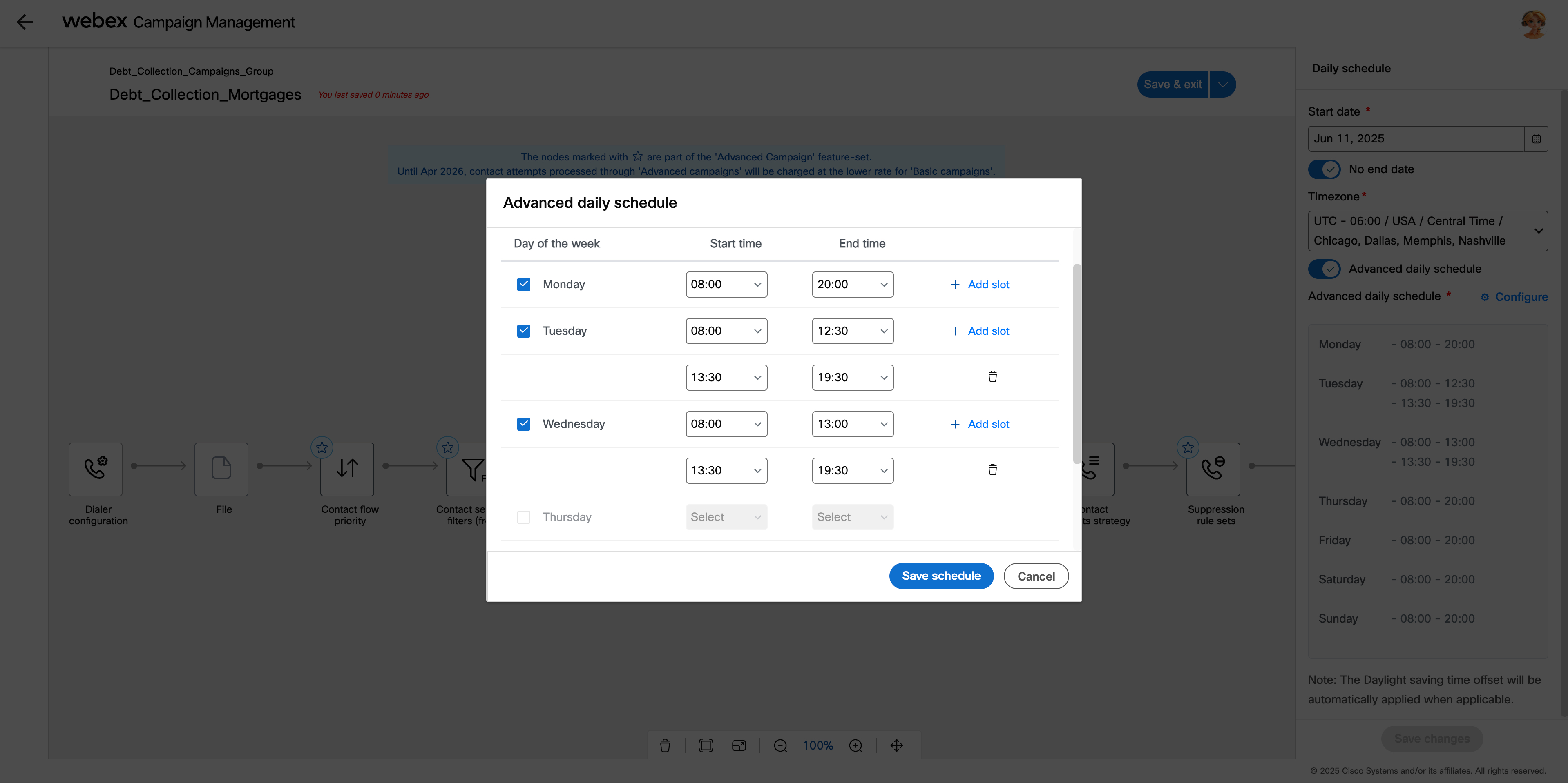 The Advanced schedule feature allows you set up different time slots for each day of the week, with up to three non-overlapping slots per day. You can also choose to disable the schedule for specific weekdays. This schedule applies only to the specific campaign in which it is configured
