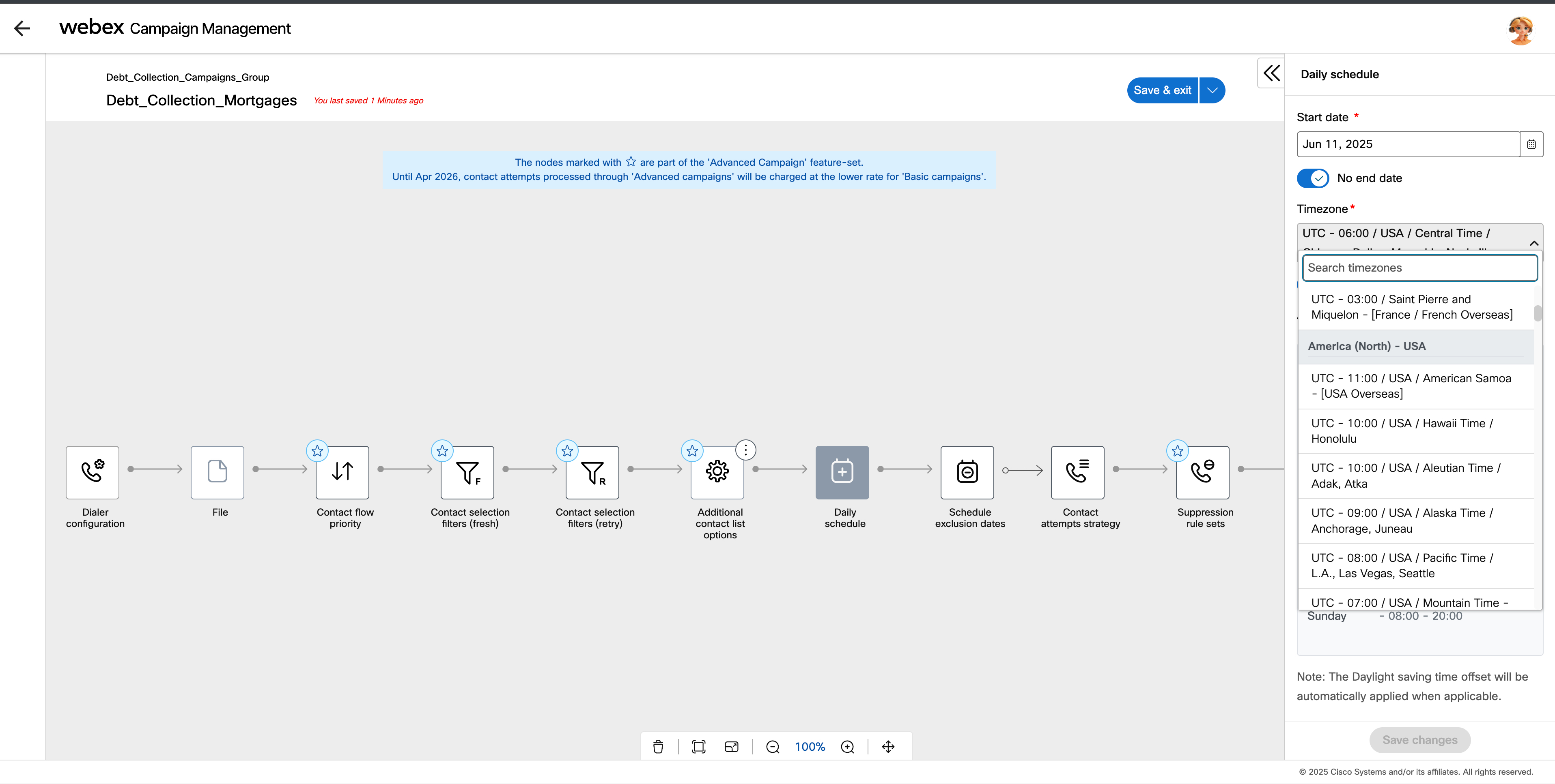 This node allows you to configure a campaign schedule, supporting multiple time zones and an option to run the campaign without an end date.