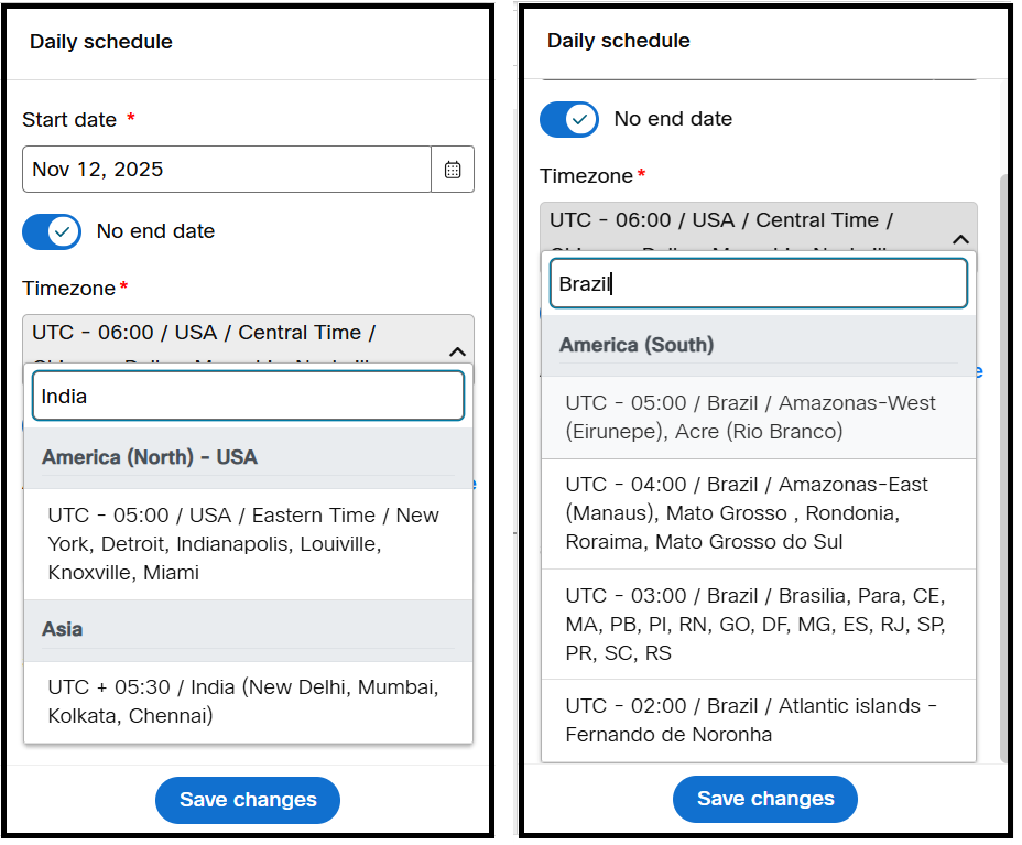Timezone: Select the desired time zone from the drop-down list. You can search for and choose a time zone by entering a city or country name. All countries are grouped by region and explicitly listed in the time zone drop-down.