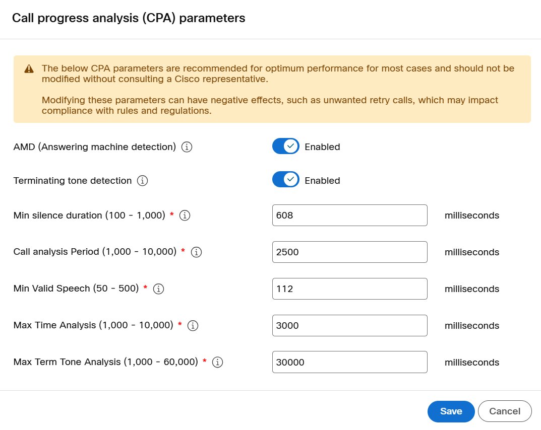 - Configure CPA parameters: Enable or disable for all calls within this campaign. The default recommended values are applied to each parameter, which you can adjust to suit your specific use case.