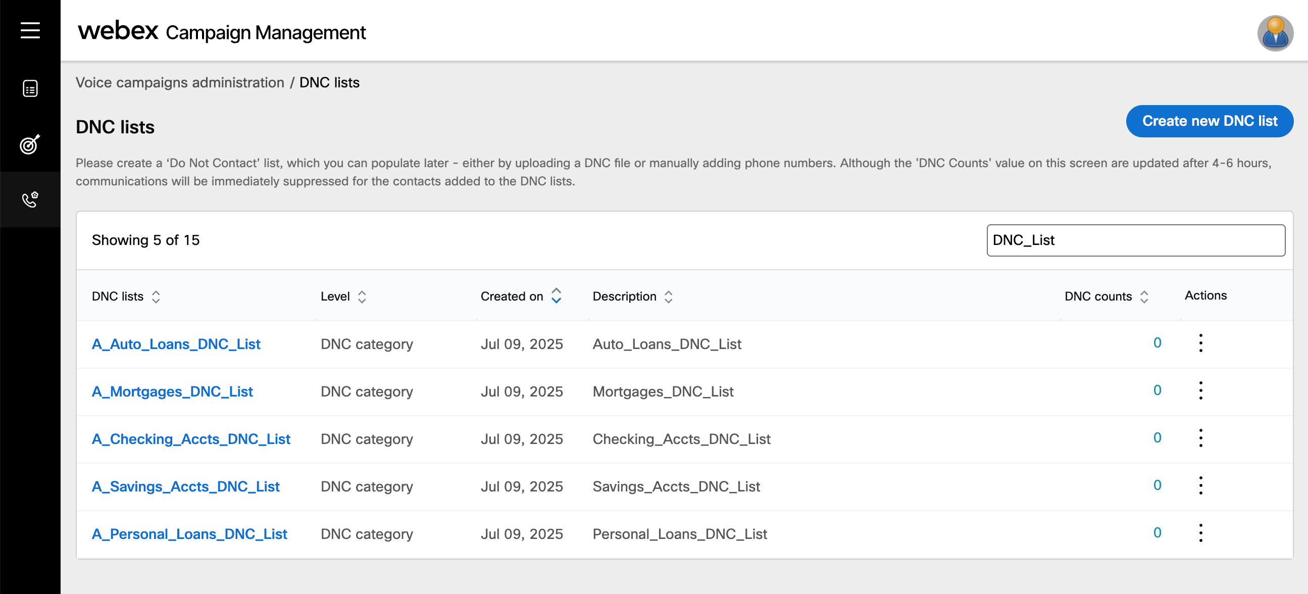 Webex Campaign Management allows you create and manage multiple DNC (Do Not Contact) lists. The contacts in DNC lists will be excluded from Target Groups before deploying a campaign. Most commonly, this is used to manage contacts who have registered for DNC with telecom operators. You can add a single or a group of mobile numbers to a DNC list.