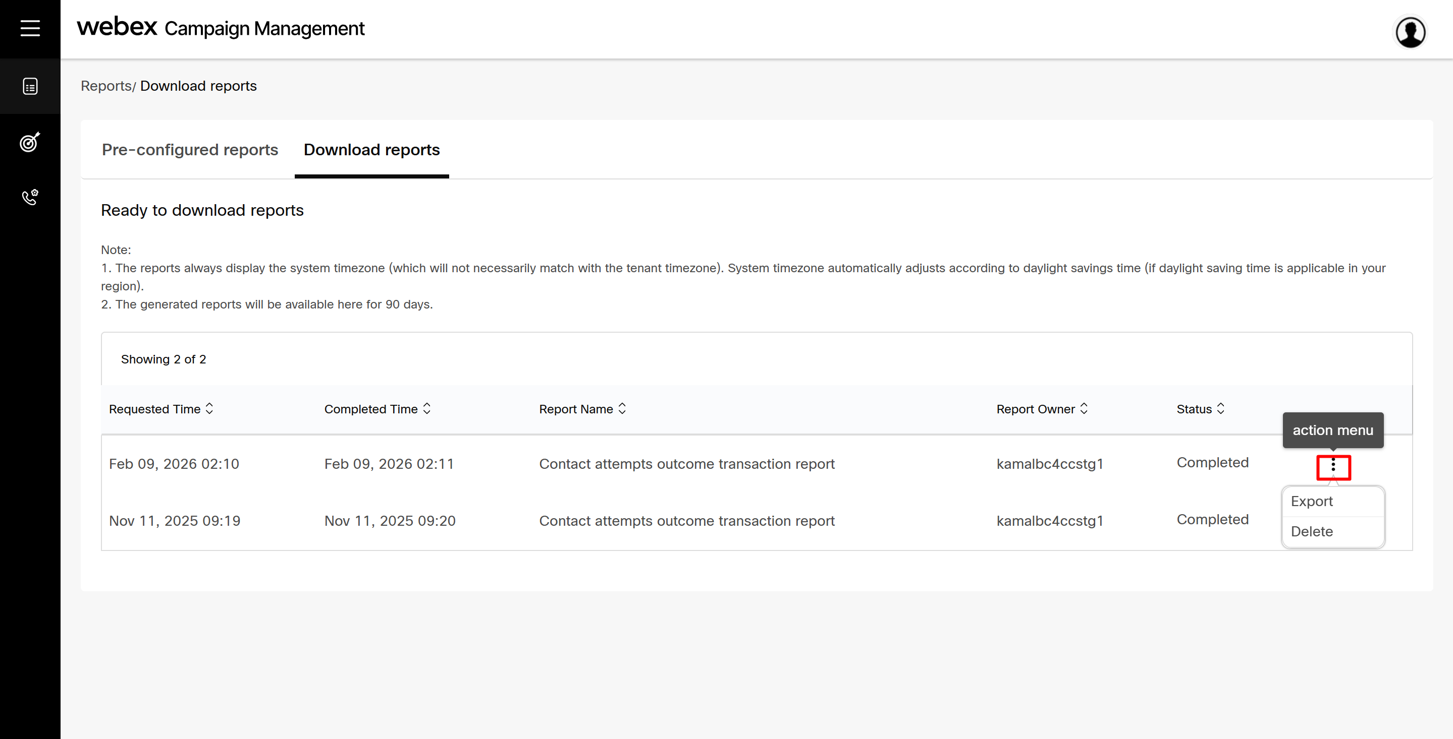 The reports always display the system timezone (which will not necessarily match with the tenant timezone). System timezone automatically adjusts according to daylight savings time (if daylight saving time is applicable in your region). The generated reports will be available here for 90 days.