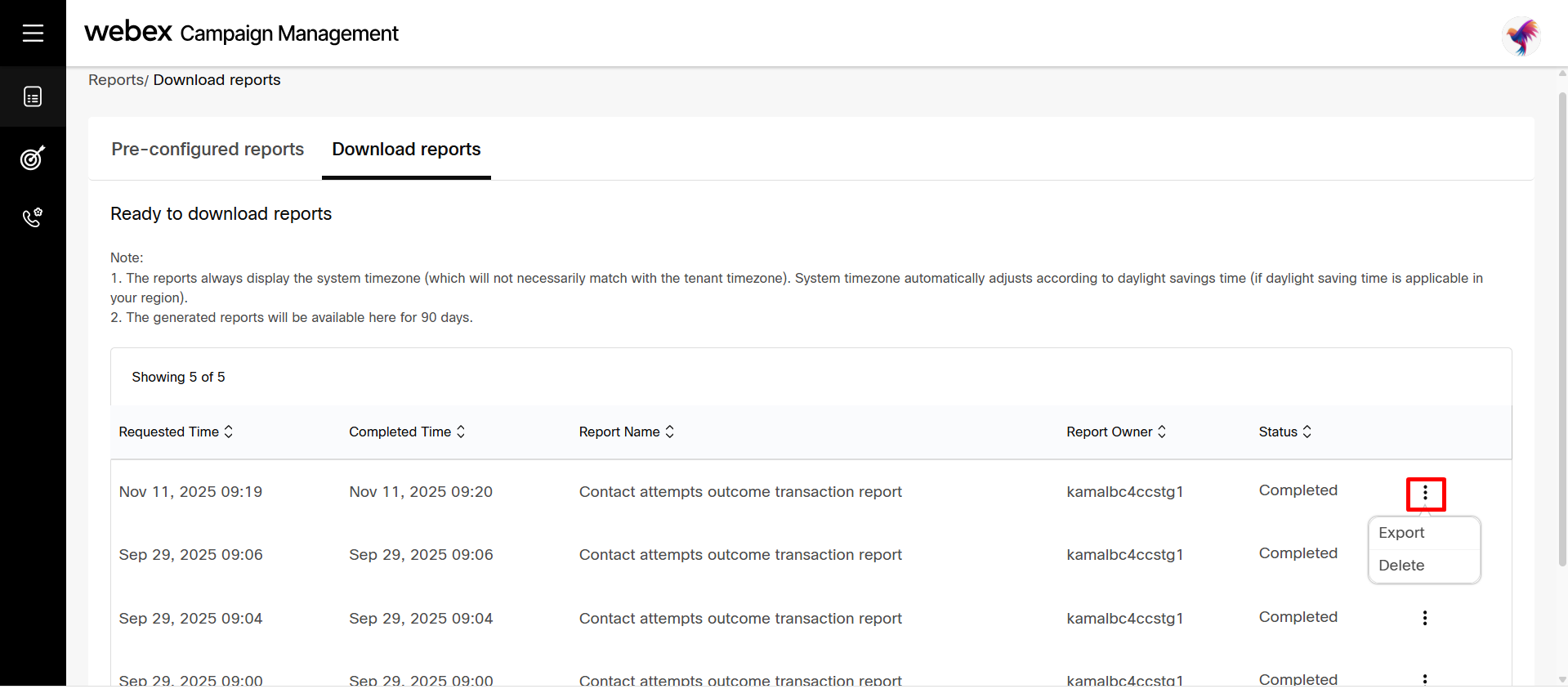 To download a report, click the vertical ellipsis icon next to the desired report and select Export. The report will be downloaded in Excel format."