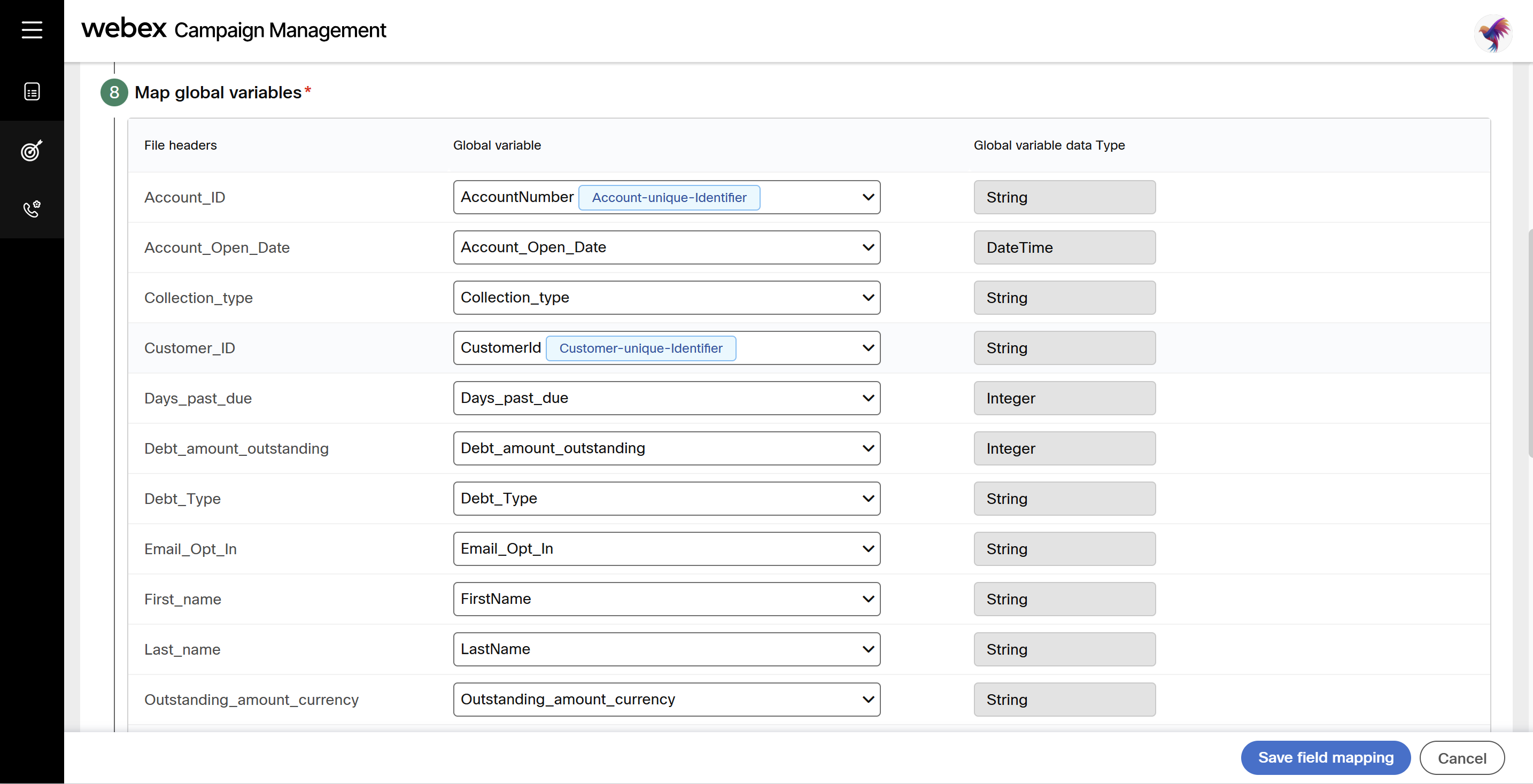 Field mappings refer to the process of uploading a template or sample data and mapping the headers with the headers of dialer system. You can also define the data type for each header or define if a header needs to be encrypted. The headers of the dialer system will be mapped to the sample data type.