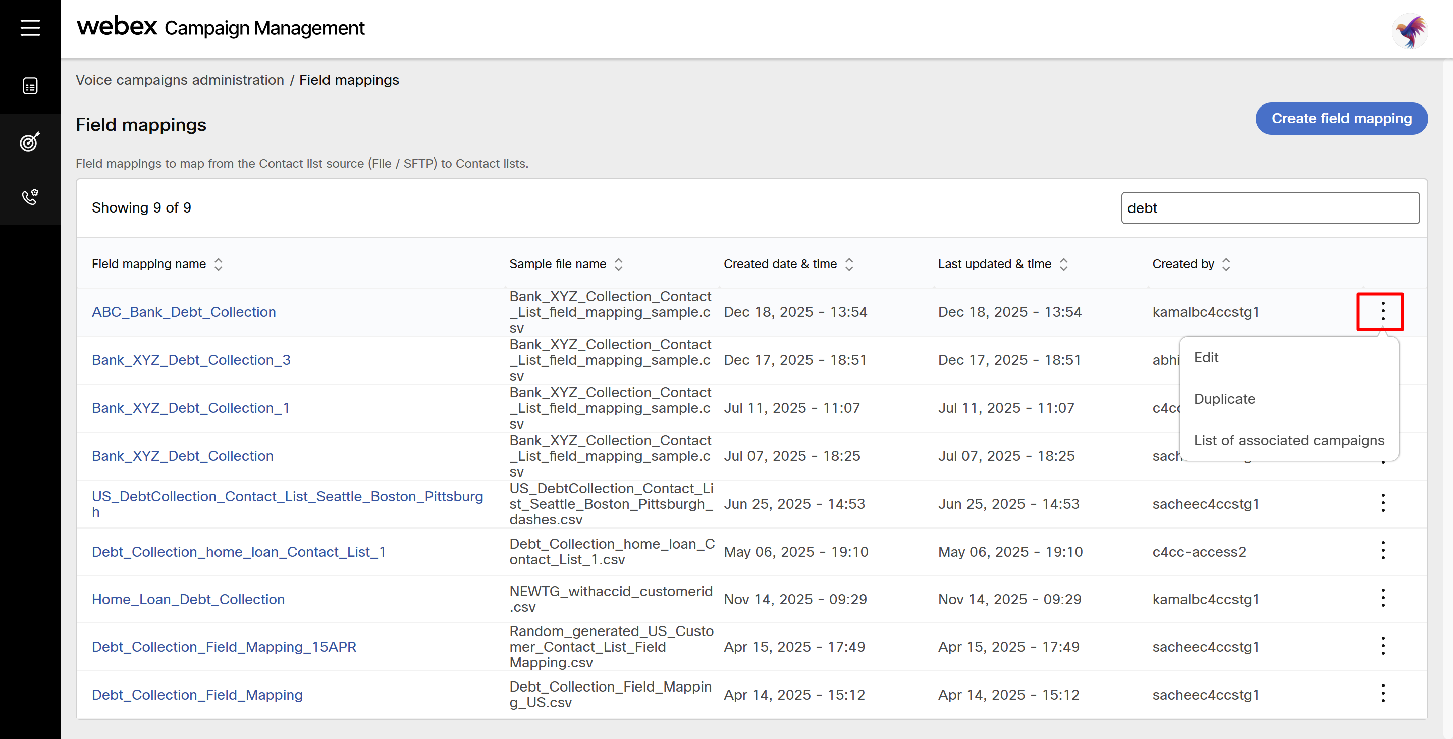 - Navigate to Voice campaign administration > Field mappings. The Field mappings list screen will be displayed.