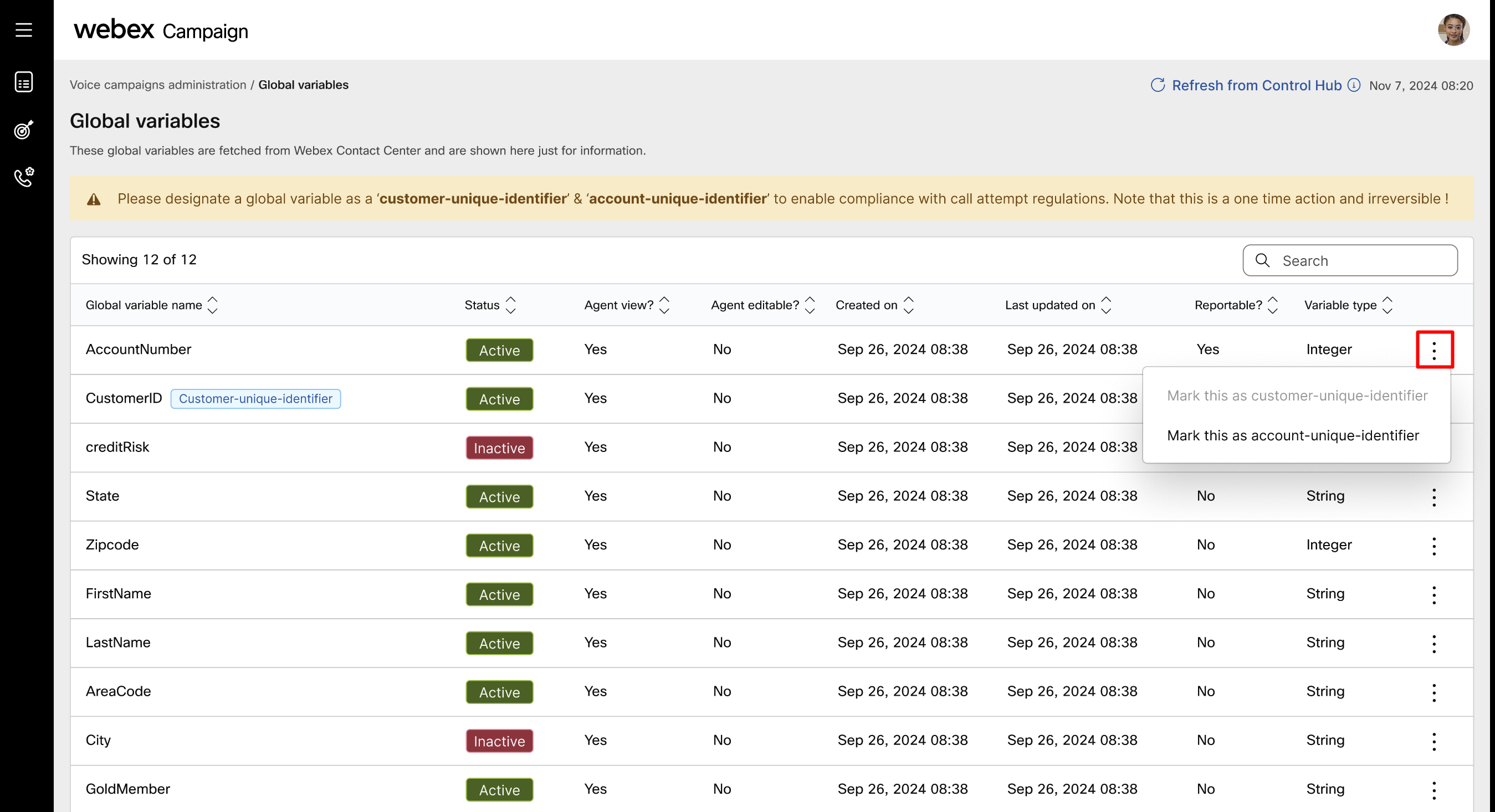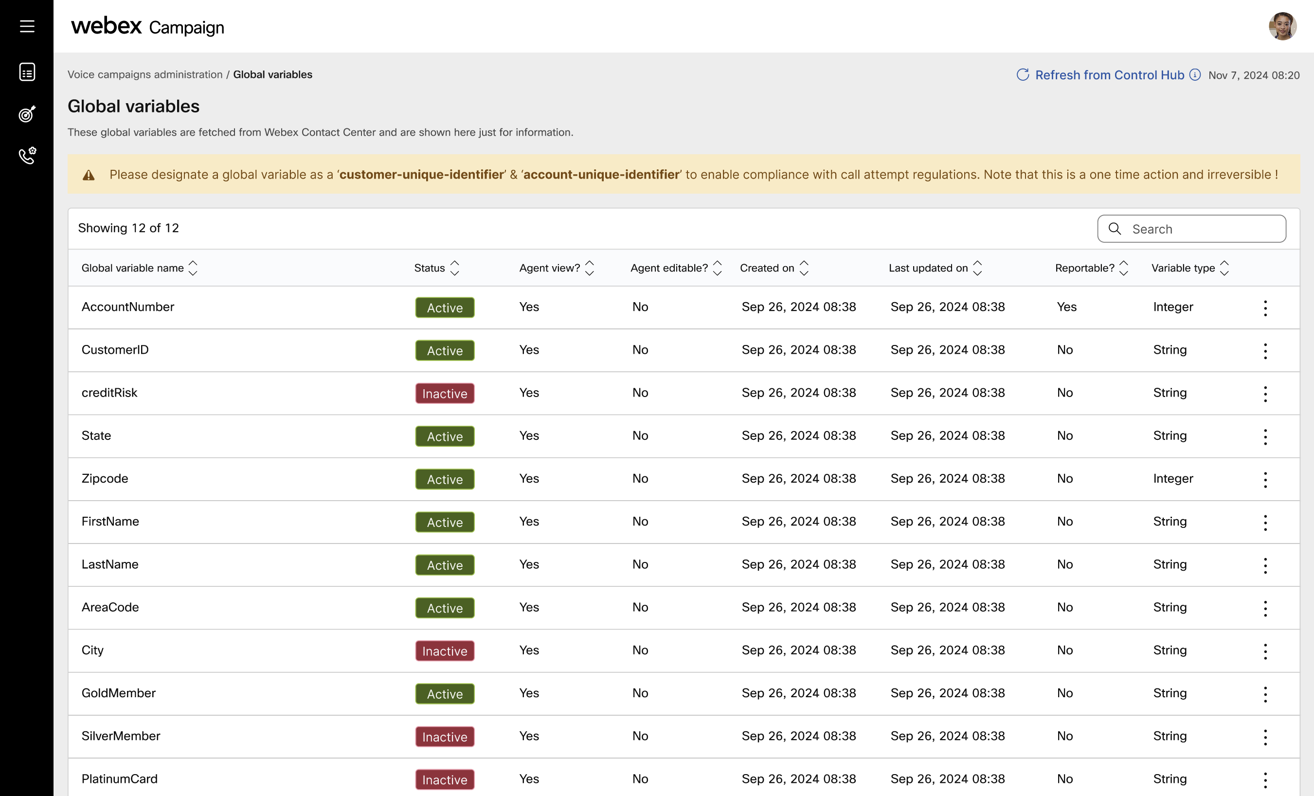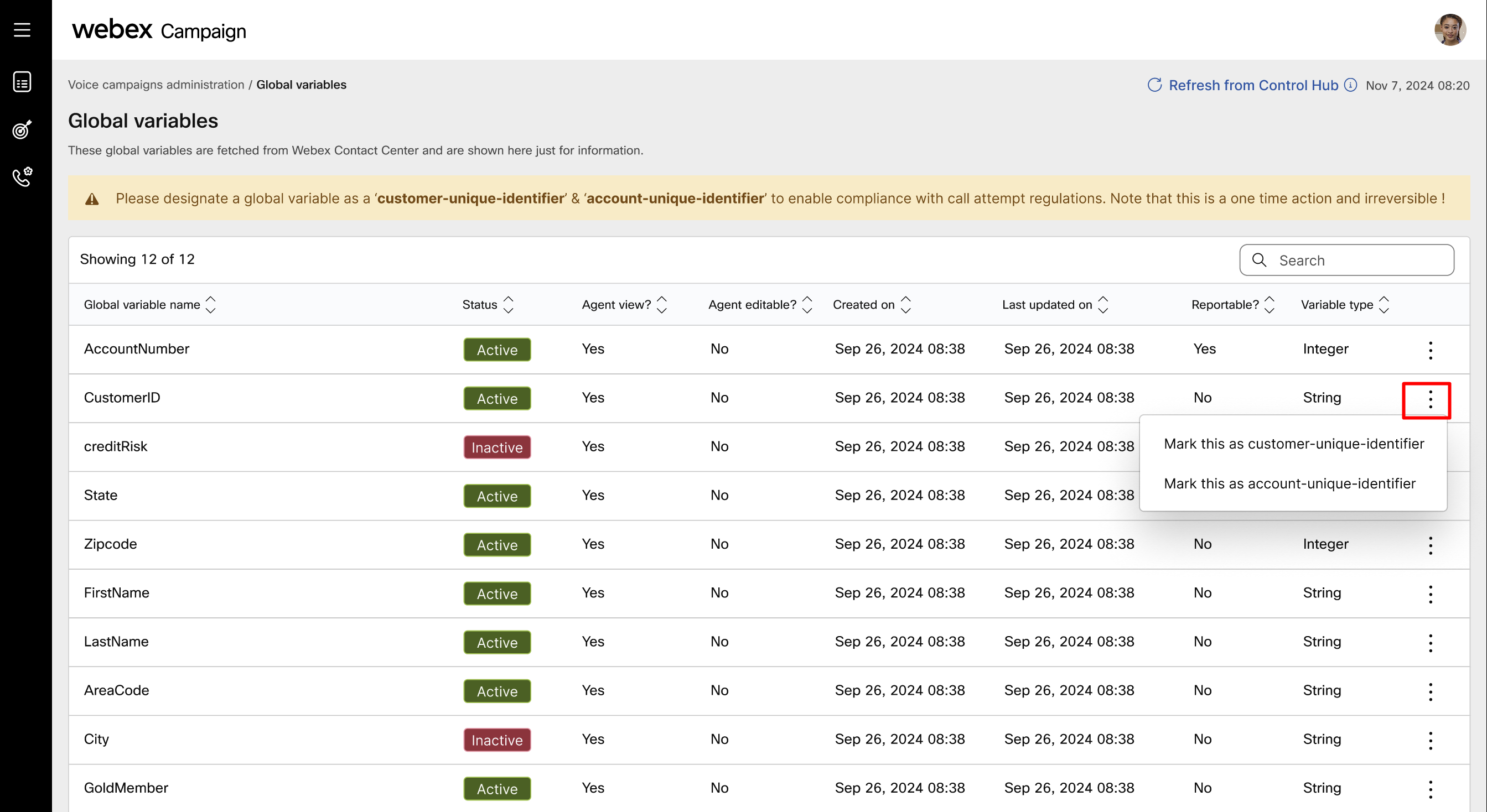 Global variables refer to the attribute values that identify a customer during calls with the agents. These attributes are configured in the control hub application. Webex Campaign will receive these variables from control hub application.