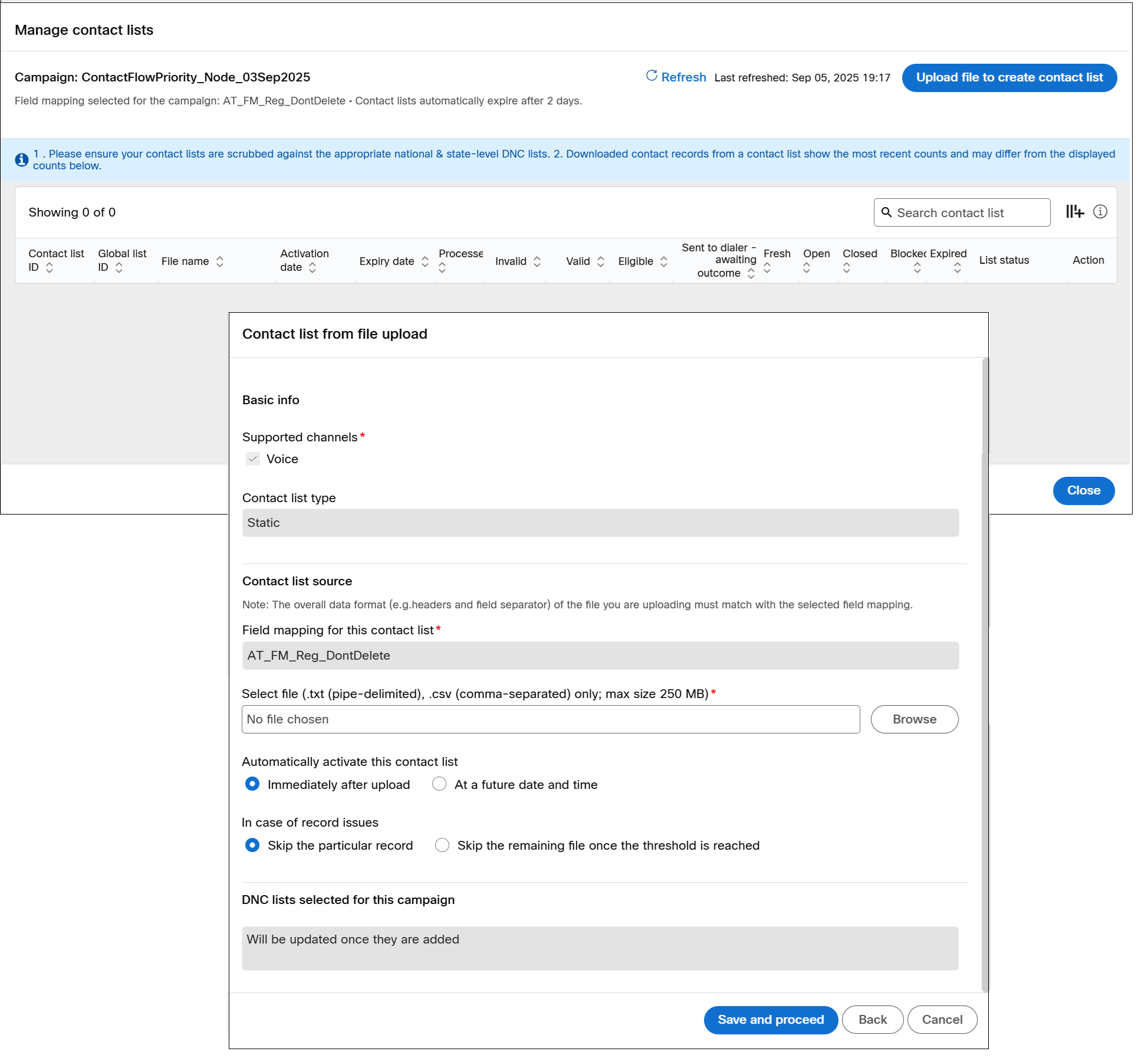 - On the Manage contact lists screen, click Upload file to create contact list.
