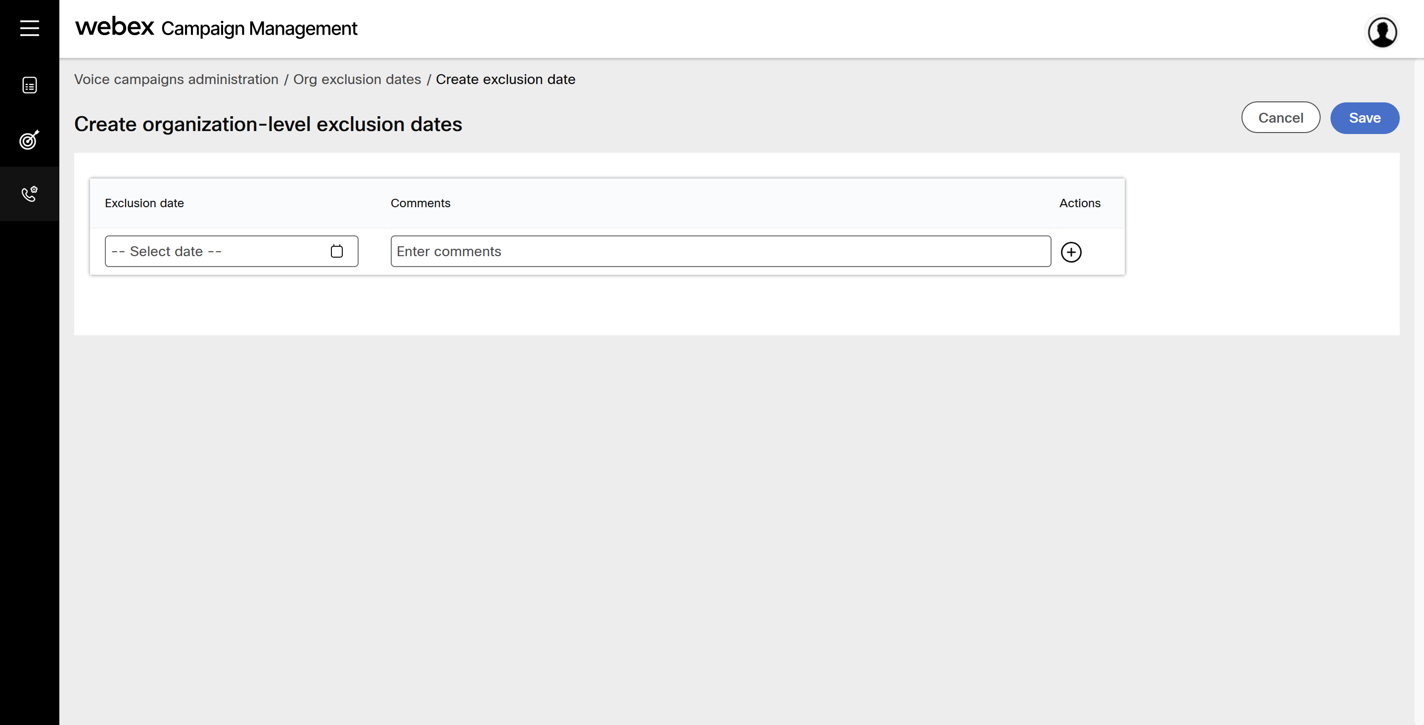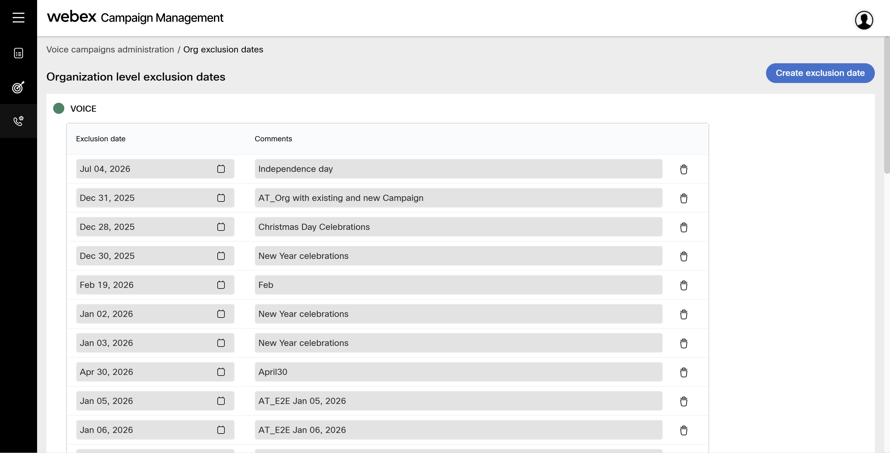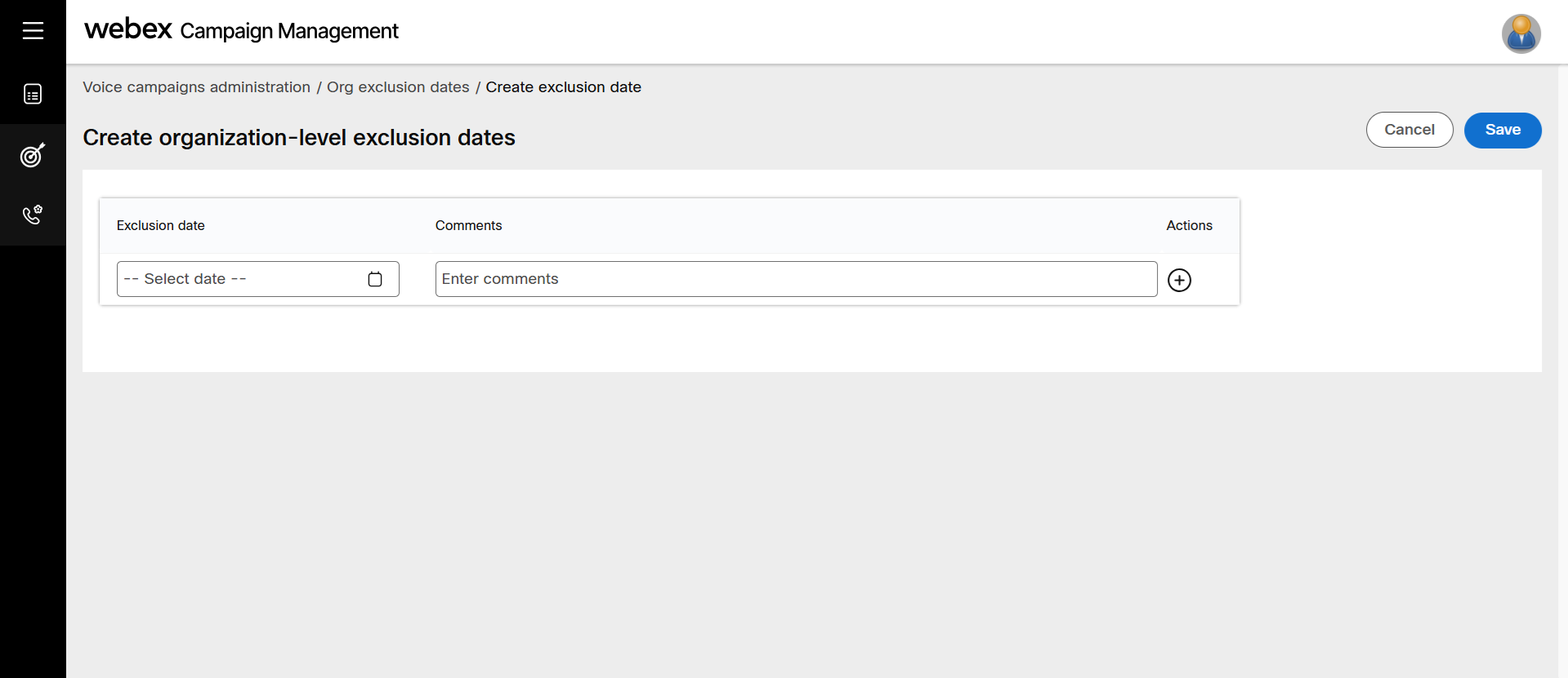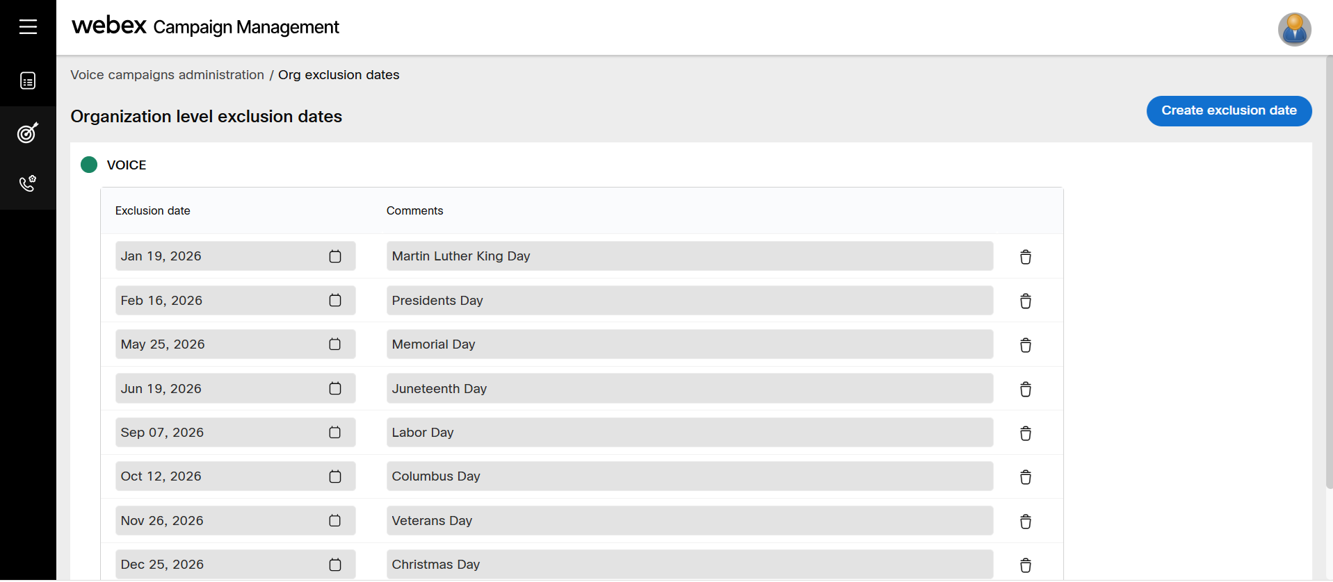 - Navigate to Voice campaign administration > Org exclusion dates screen.