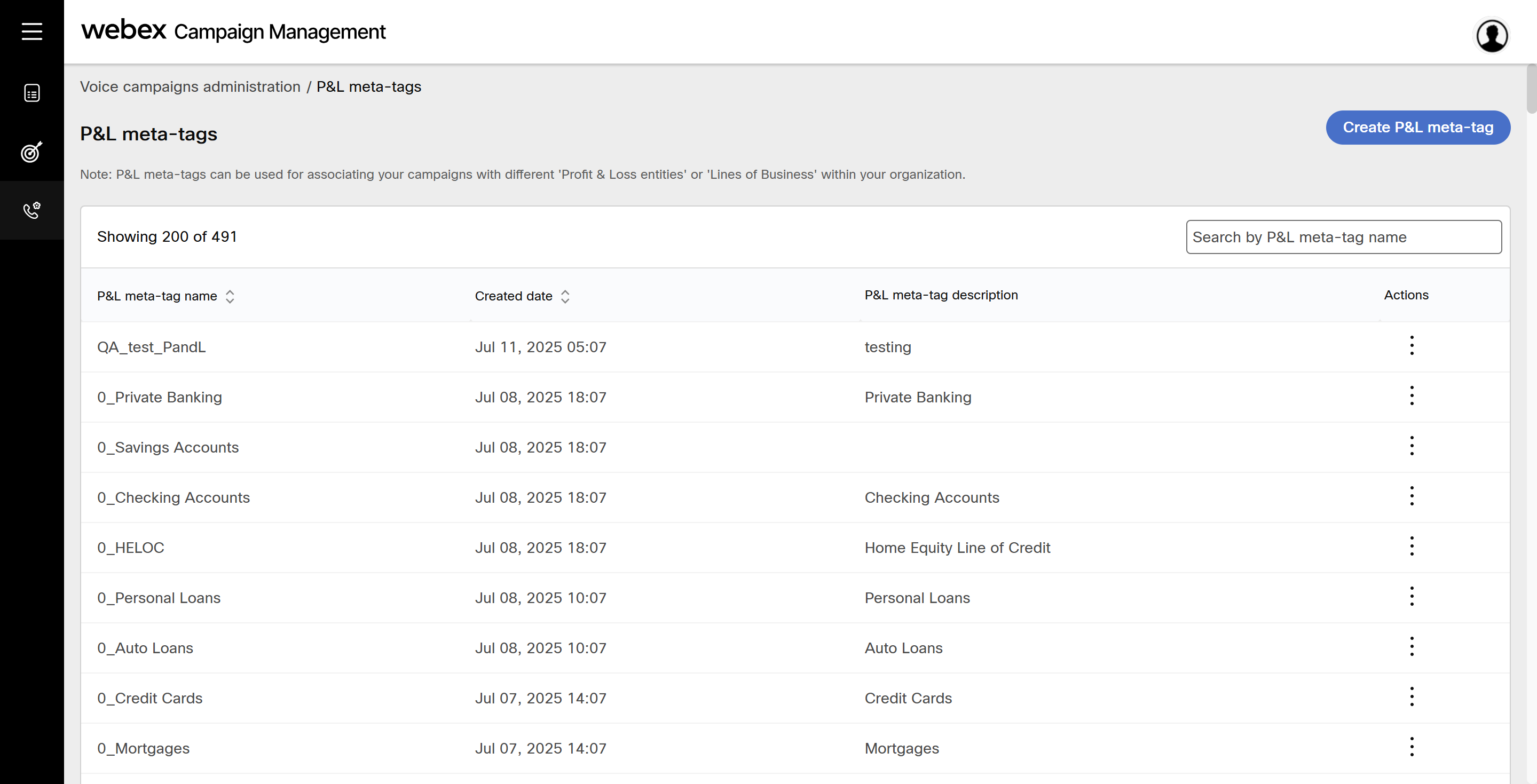 - Navigate to Voice campaigns administration >> P&Ls meta-tags. Click Create P&L meta-tag.