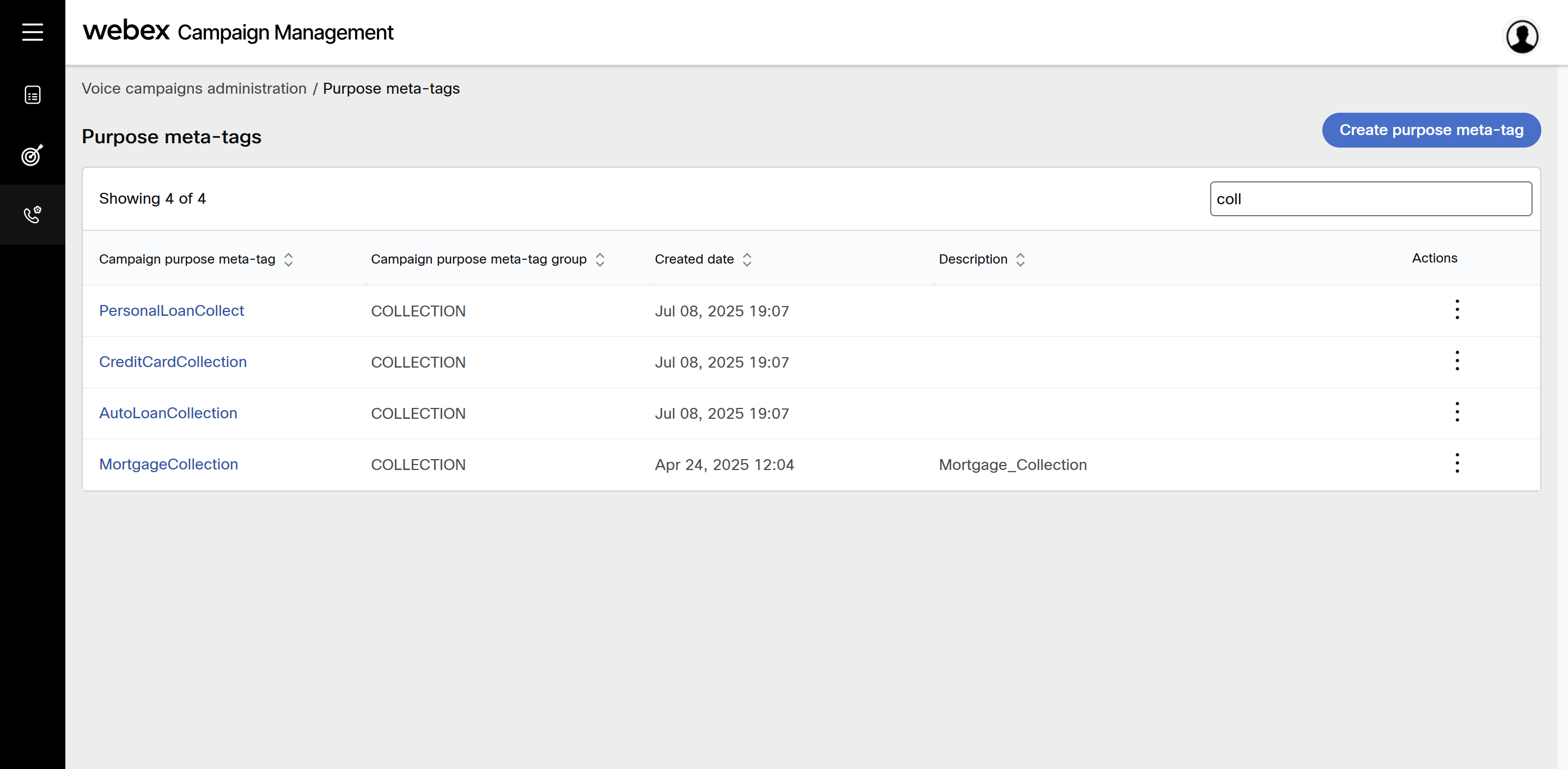 - Navigate to voice campaigns administration and click Purpose meta-tags.