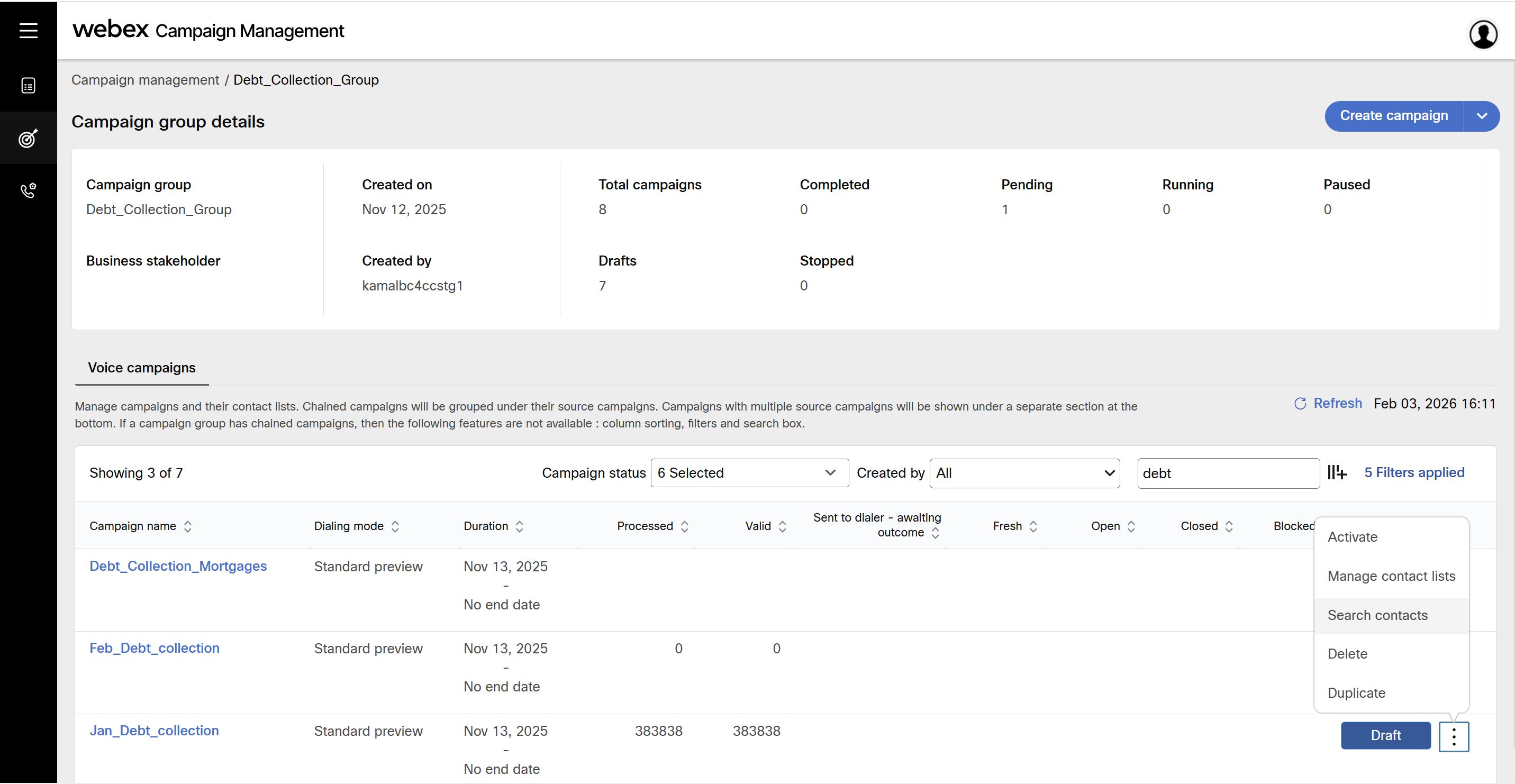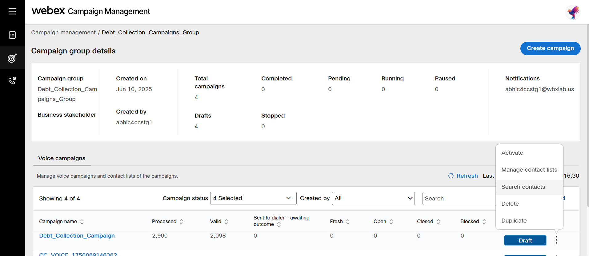 - Click on the ellipse icon of the campaign and click Search contacts.