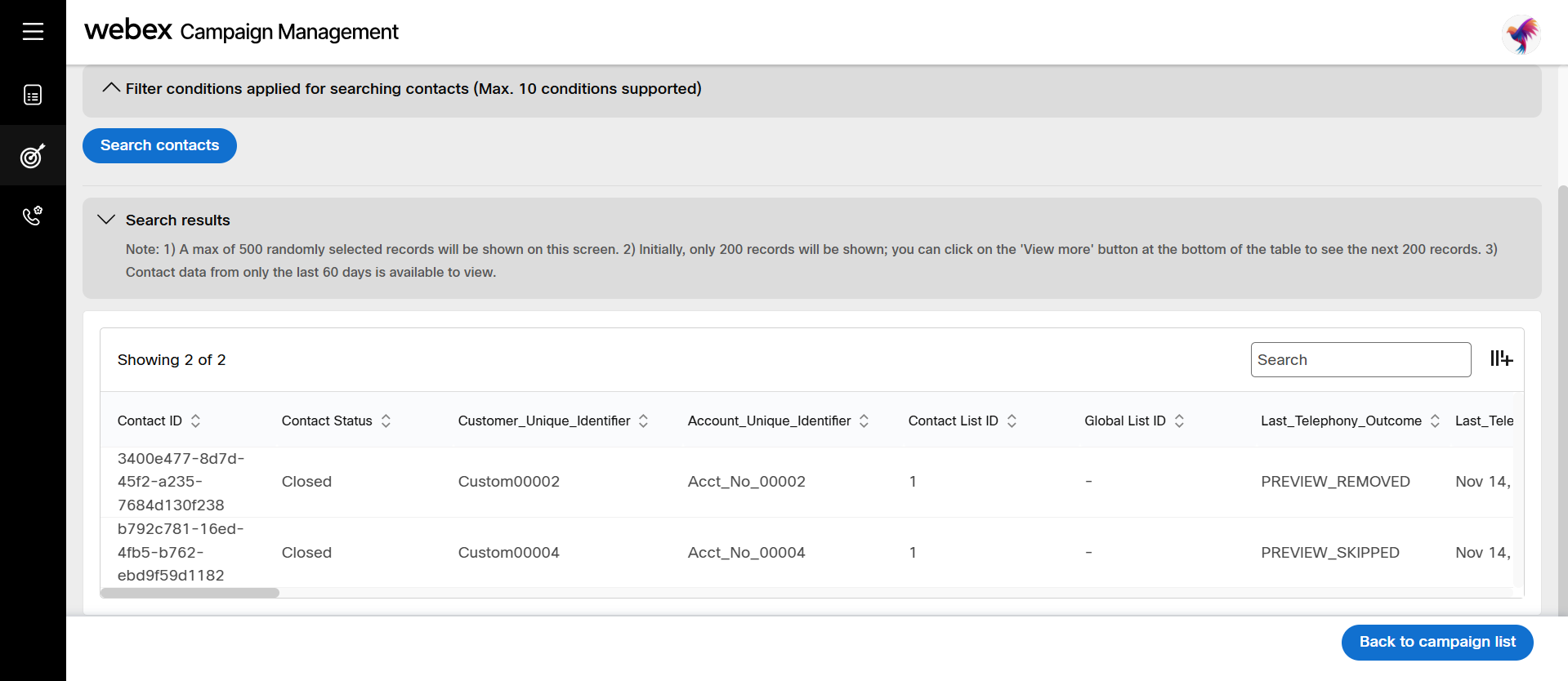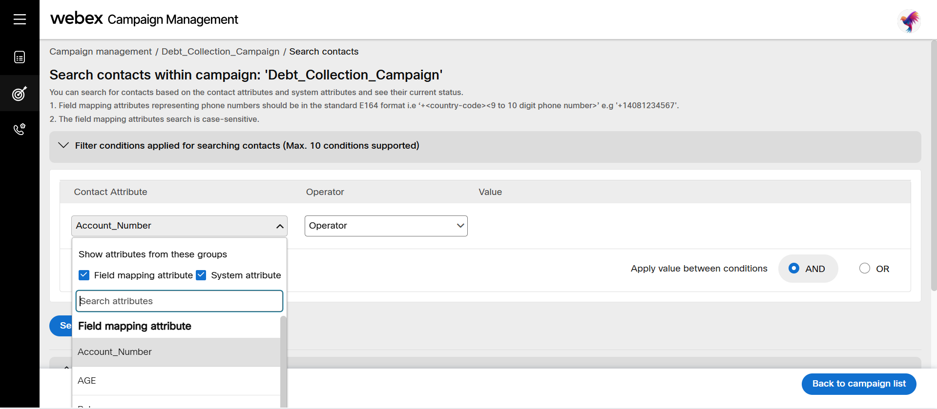 After a campaign is activated and executed, you may need to check the status of a specific contact. For example, a contact with a low credit score. In these cases, you can search for the contact using their mobile number or any contact attribute (such as field-mapping or system attributes).