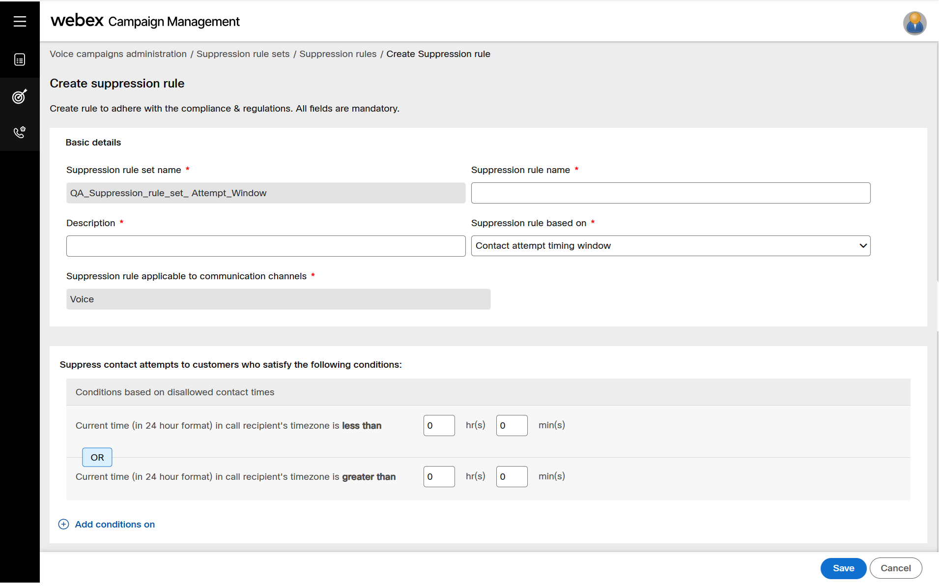 - Add conditions on: You can add conditions.to suppression rules: You can create conditions to apply the suppression rule for the contacts based on their USA state or Phone area code or a global variable.
