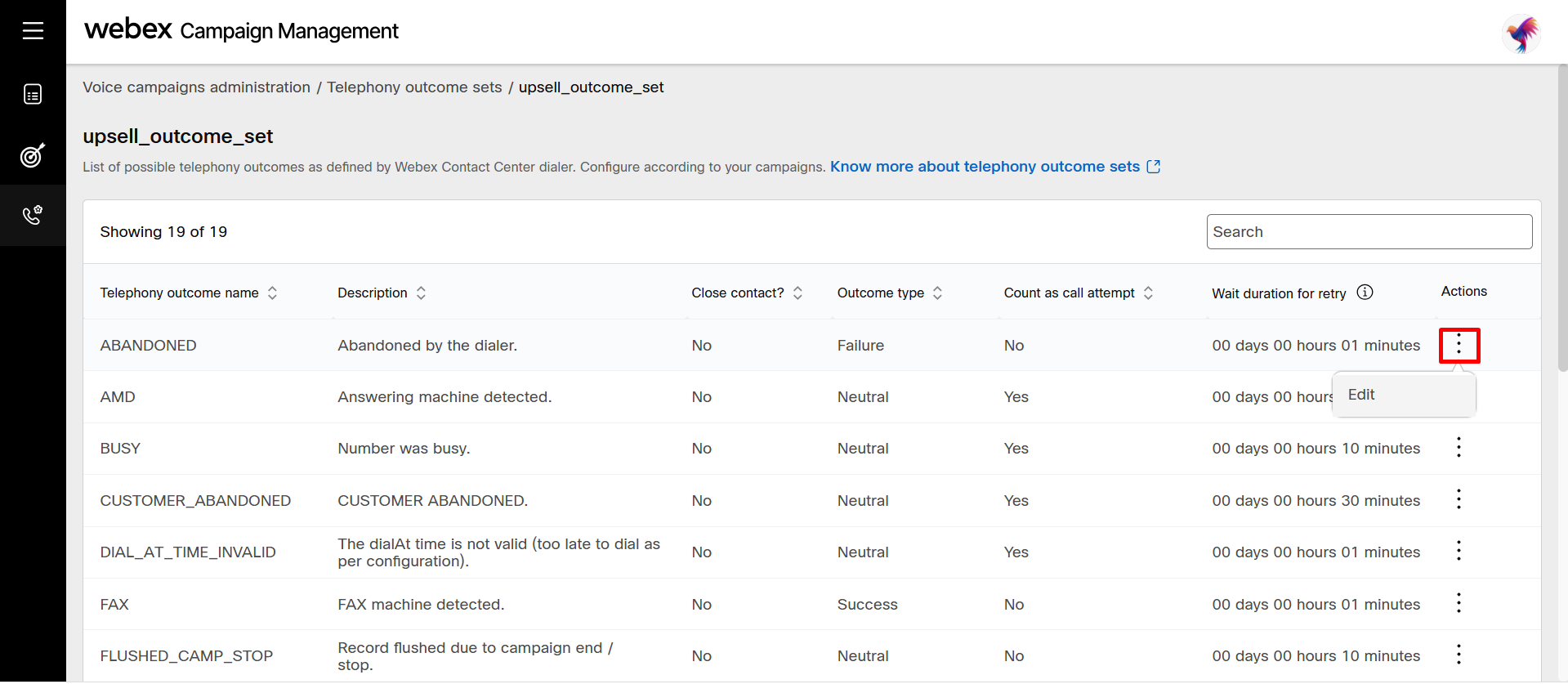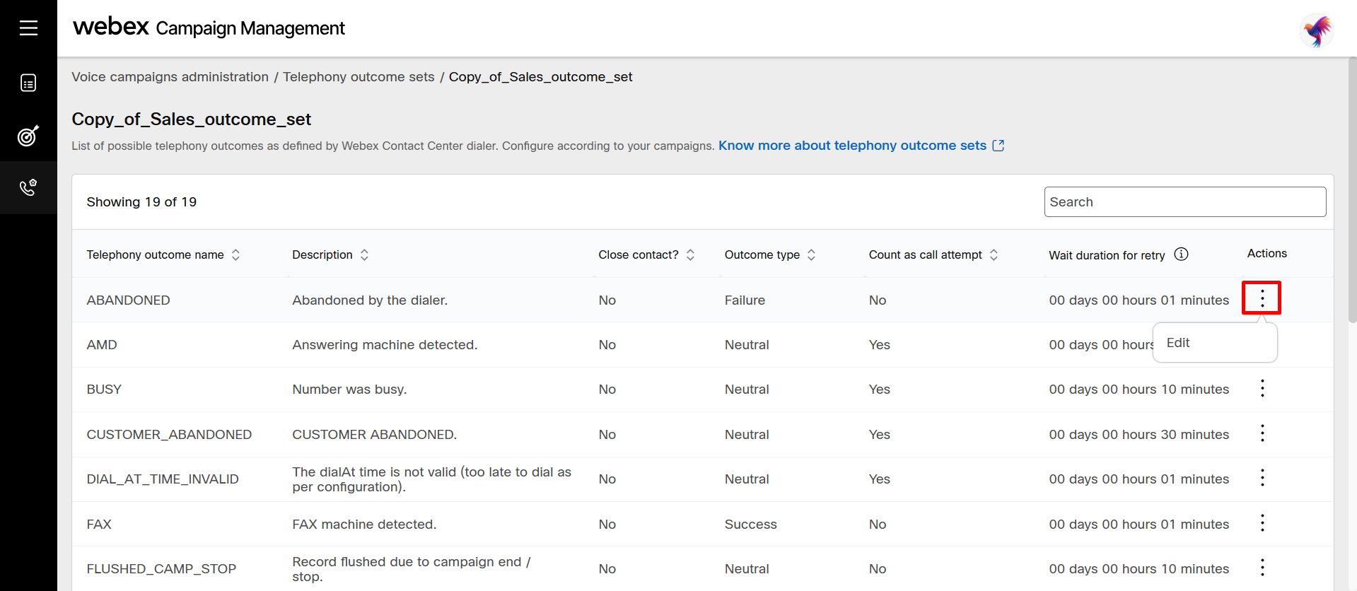 - The telephony outcome set will display all the outcomes of the set. Click the ellipses icon of the required outcome and click Edit.