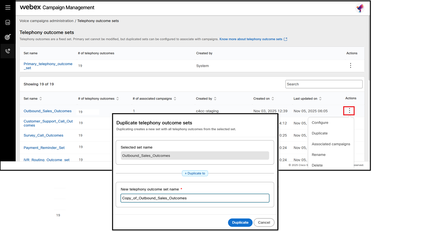 - Click the ellipses icon of the Primary_telephony_outcome_set and click Duplicate.