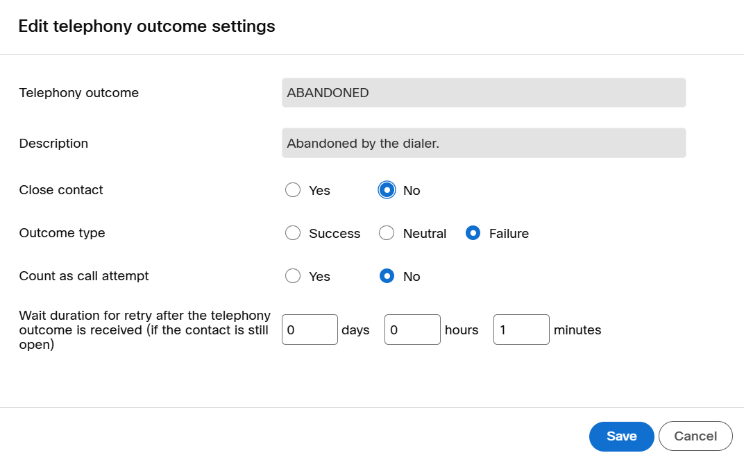 - Wait duration for retry after the telephony outcome is received (if the contact is still open): Configure the wait time before the next call attempt.