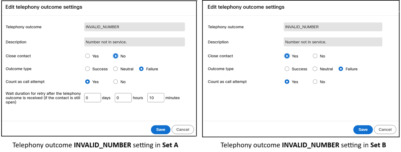 For example, the telephony outcome INVALID_NUMBER in Set A can be configured with Close contact = No, while the same telephony outcome in Set B can be configured with Close contact = Yes.