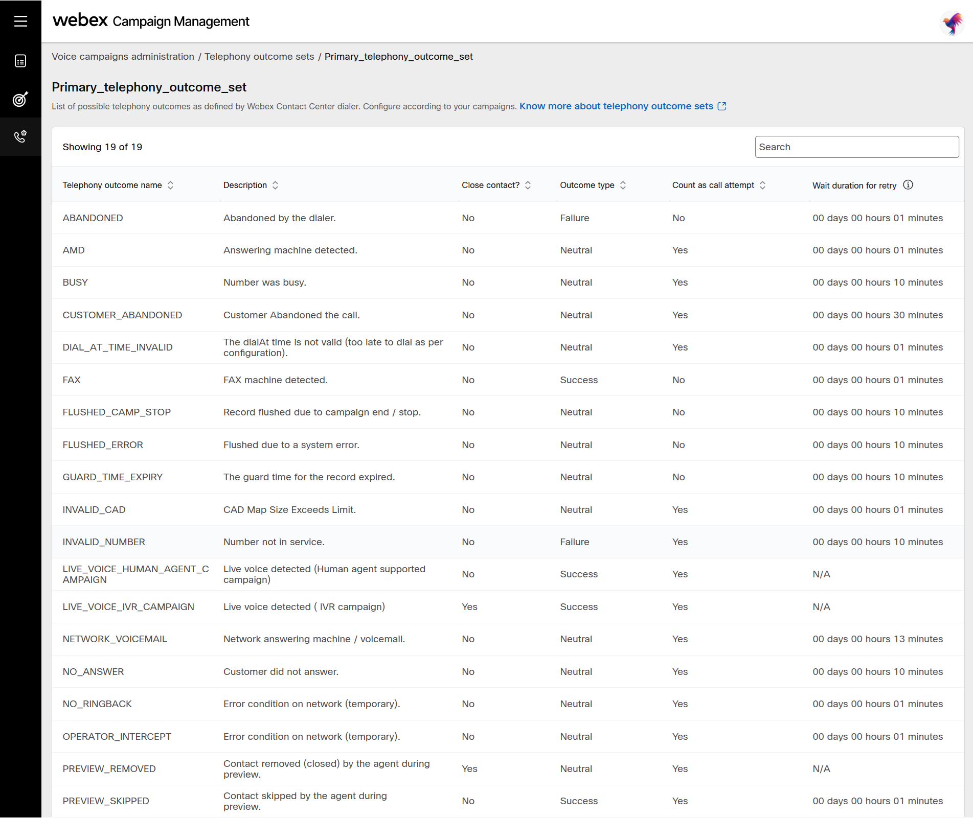 Default telephony outcome set: If you see this set in the telephony outcome settings screen, it means that you were using Campaign manager before this feature went live. This is a default set created to have all the telephony outcomes which were configured previously in your tenant.