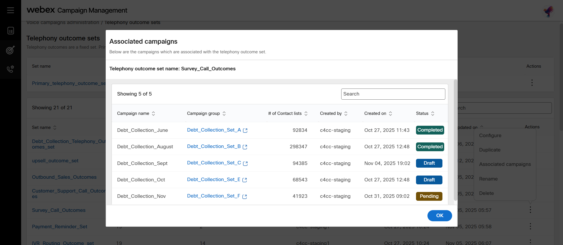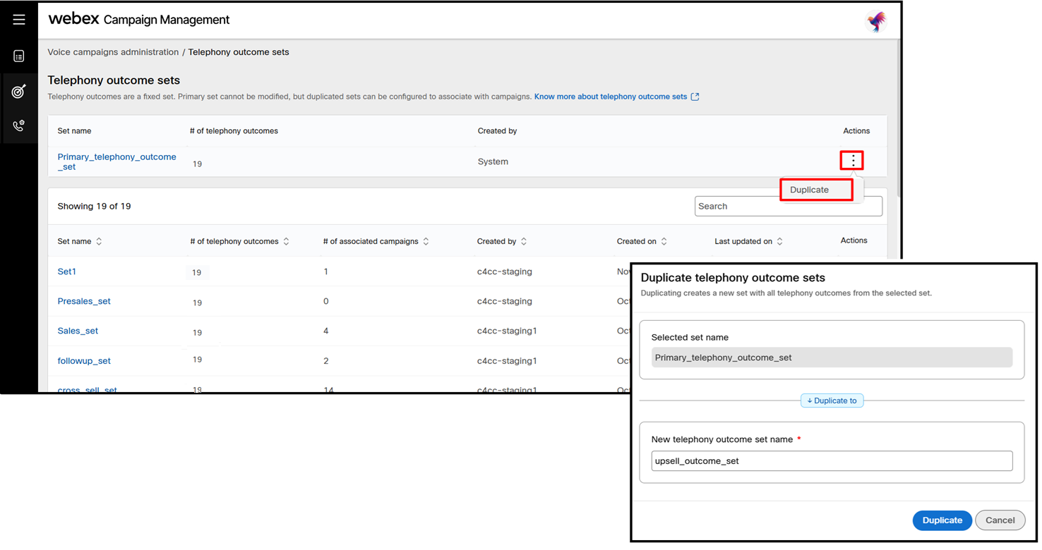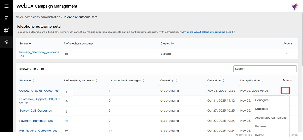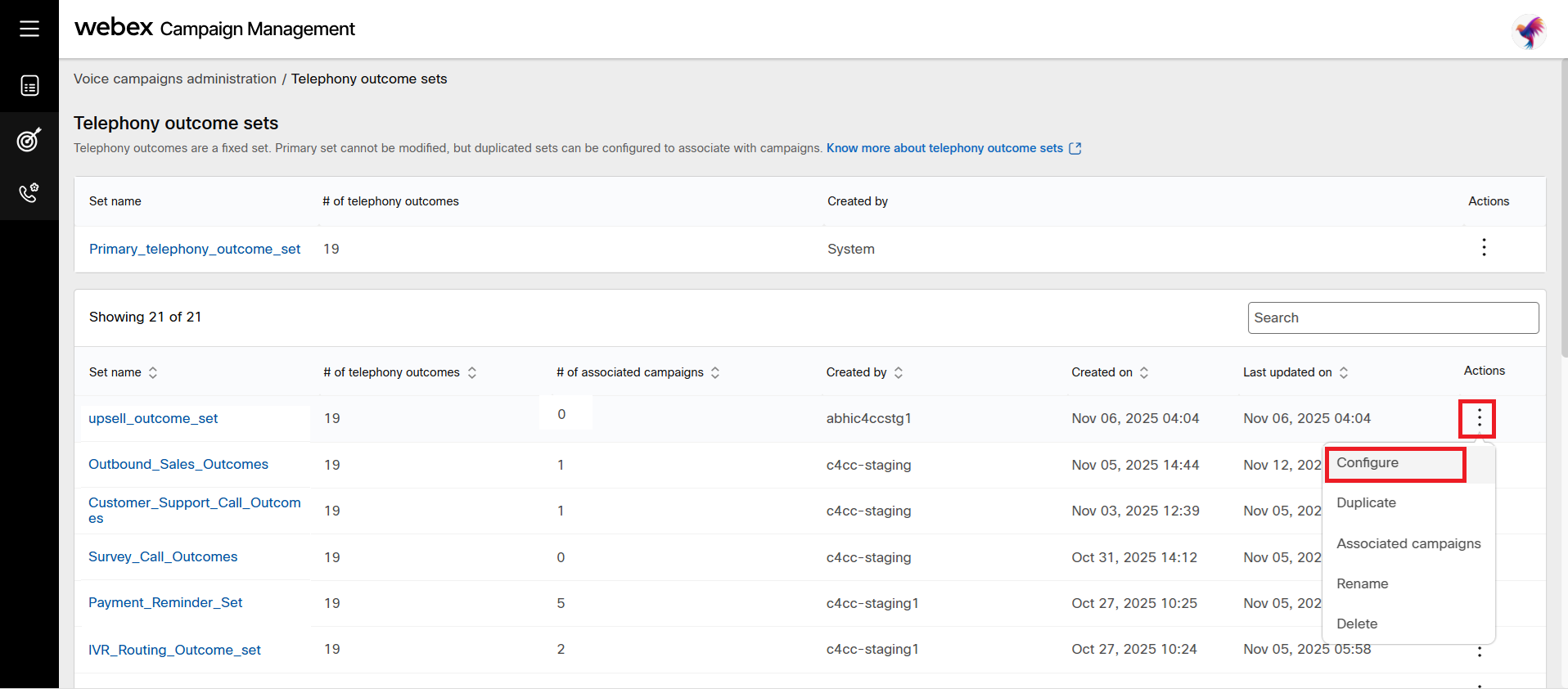 - (Optional) Click the newly created set and edit required telephony outcome setting as needed.
