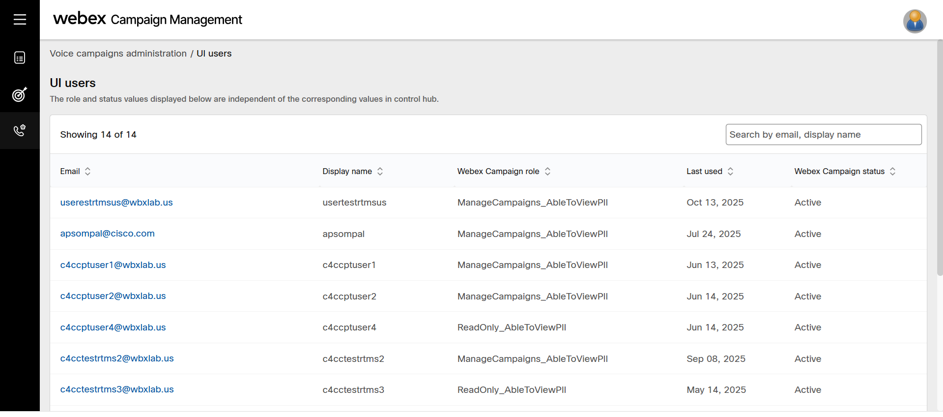 The UI user list screen displays a list of users along with information such as their display name, Webex campaign role, last used, and Webex campaign status.