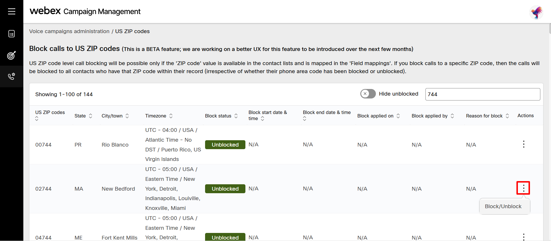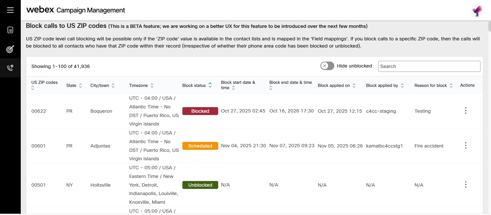 You can block a ZIP code for a specific duration or schedule. When a ZIP code is blocked, the dialer will skip phone numbers associated with that area. Once the scheduled period ends, the system automatically unblocks the ZIP code. You can also manually unblock or reset a ZIP code at any time if required.