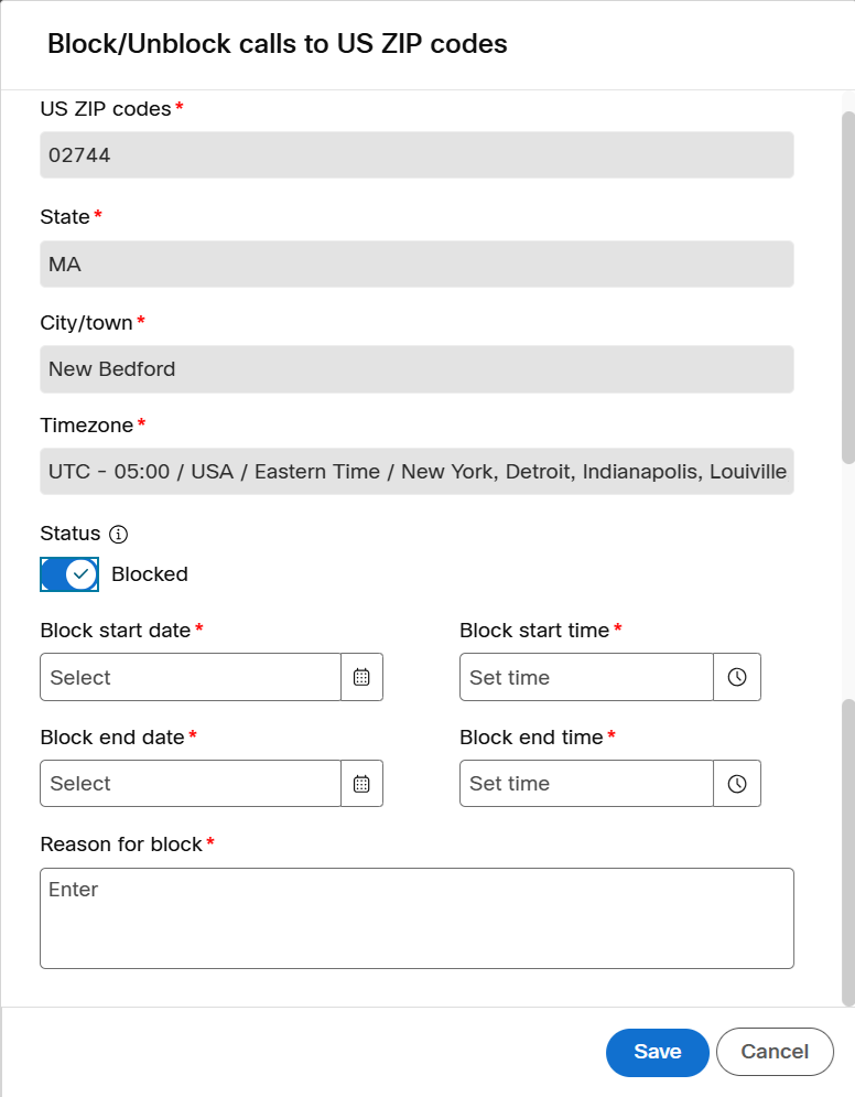 - Status: Enable to block the ZIP code and configure the options that are displayed.
