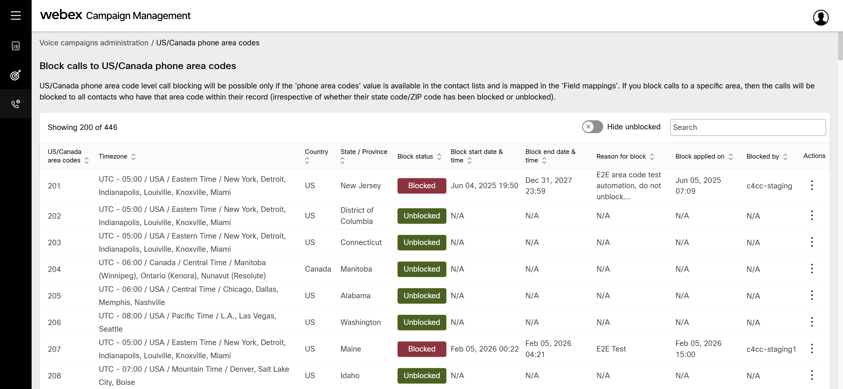 - Navigate to Voice campaigns administration section and click Block calls for US/Canada Phone area codes.