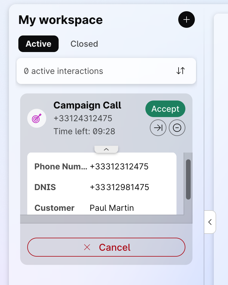 A Preview dialing mode allows an agent to view the contact information before a call is initiated. Upon creating a campaign and assign to a team, the agent can view the contact's information. After viewing the information, an agent can accept or reject the call. If an agent accepts the call, the system places the call to the customer.